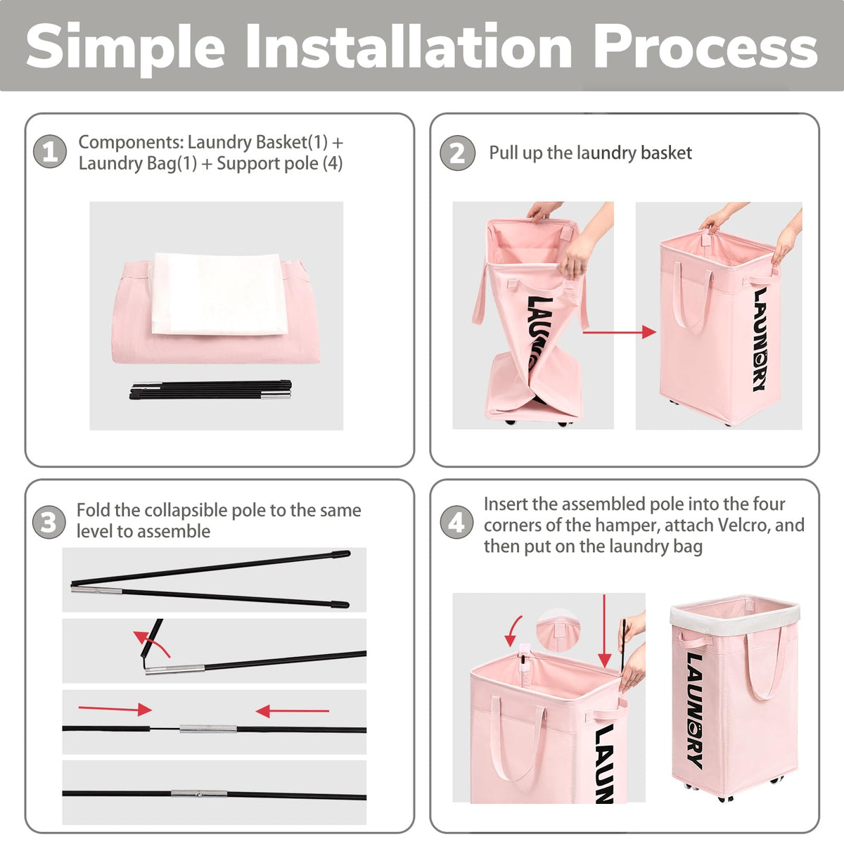 Chicvita Laundry Hamper With Wheels 2-Pack, 75L Collapsible Laundry Basket With Removable Wash Bags, Pink Laundry Hamper For Cor