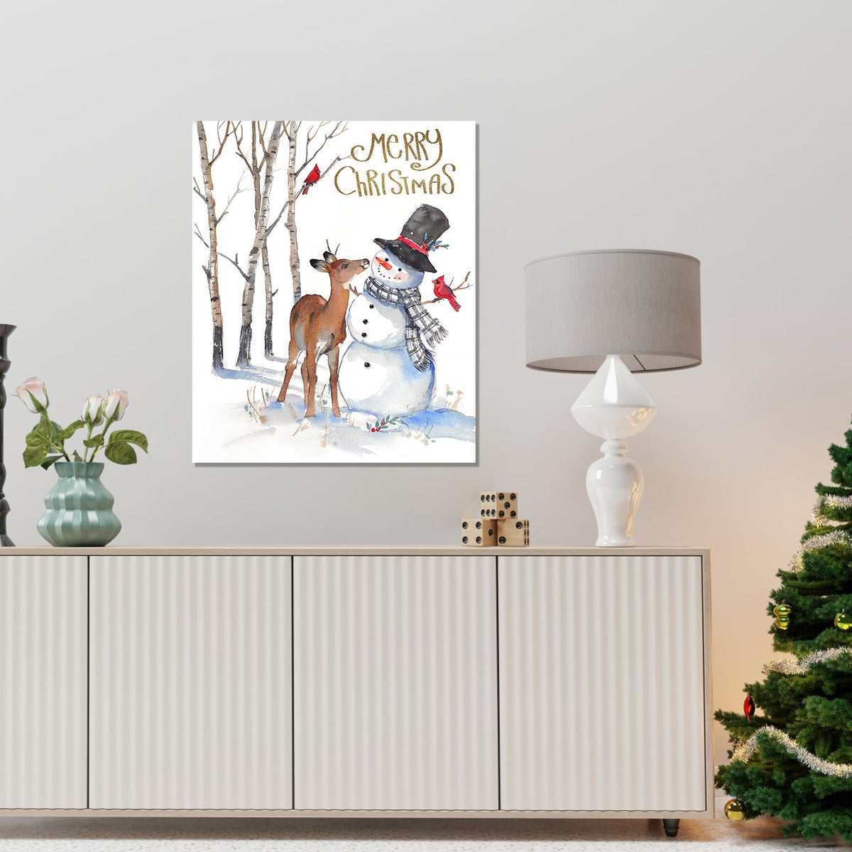 - Q: What is the theme of the artwork? A: The artwork features a charming snowman and deer in a winter wonderland scene, with 'Merry Christmas' text to enhance the festive spirit.