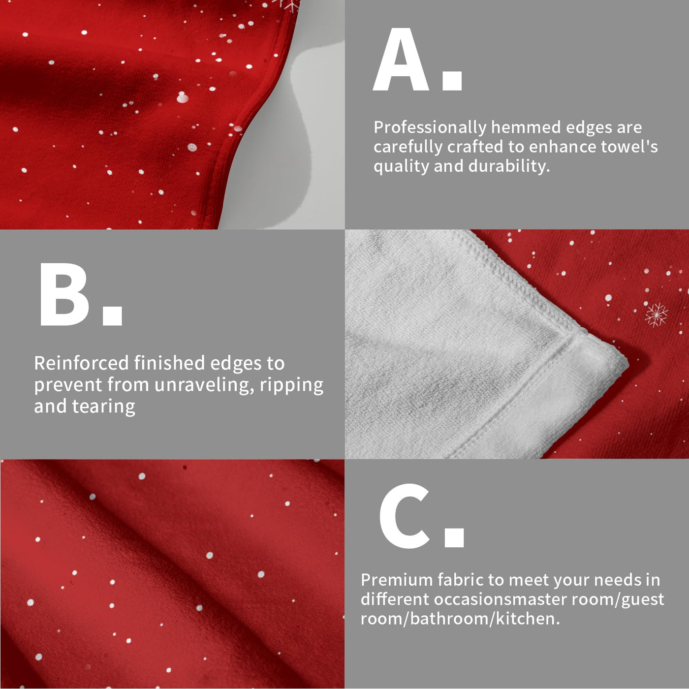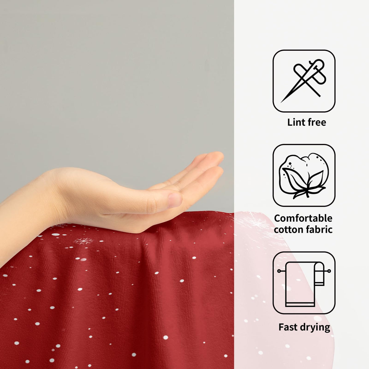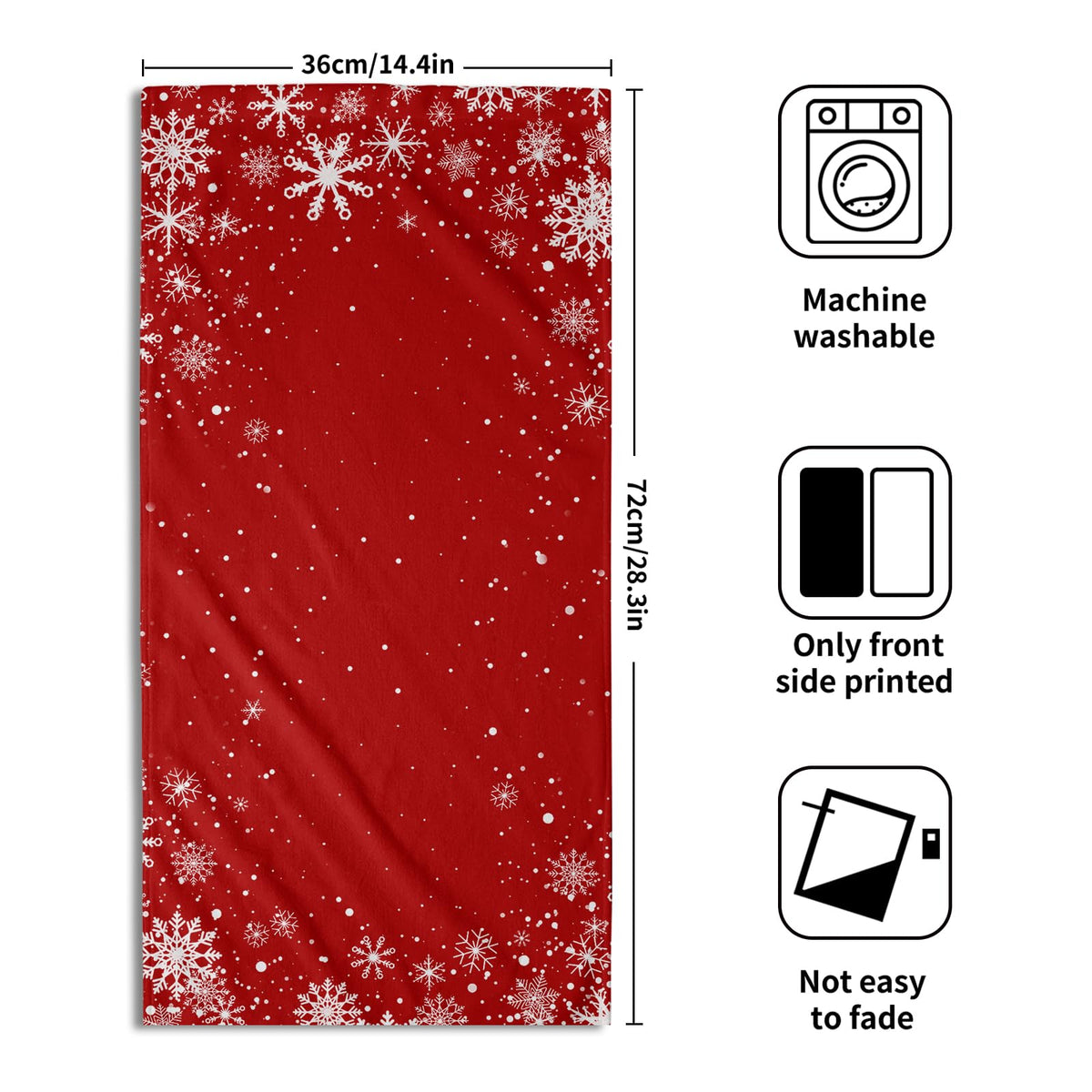 • Q: What is the printing style on the towels? A: The towels feature single-sided printing with a festive red Christmas Snowflakes pattern.