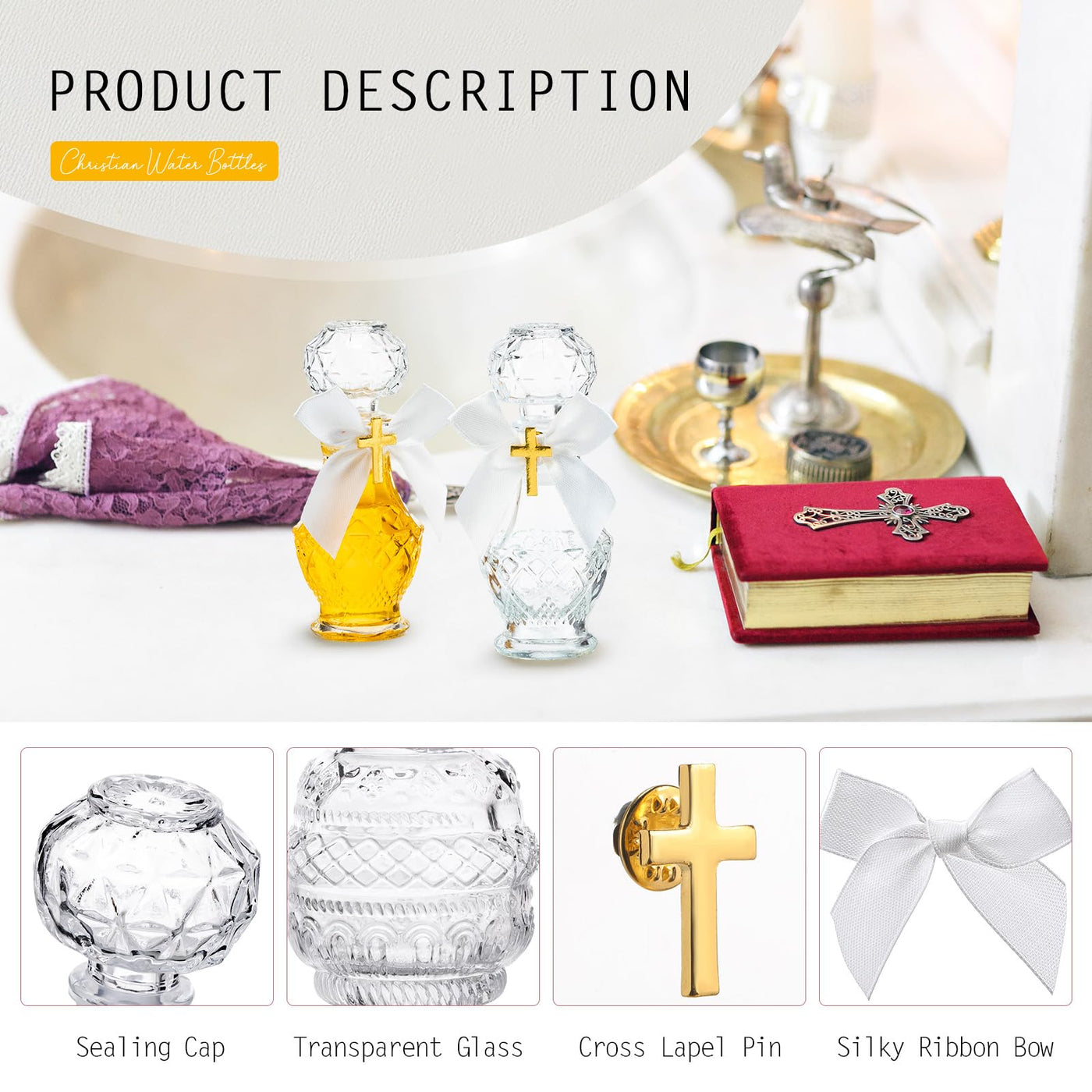 Features: The glass holy bottle sturdy and reusable, easy to clean, can be placed where you want. The glass holy bottle equip with cross pin and ribbon bow to decorate, adding a touch of aesthetic and elegance. Specifications: Material: Glass holy bottles: glass Color: Glass holy bottles: transparent Cross pins: gold Ribbon bow: white Size: Glass holy bottles: about 1.97 x 4.53 inches/ 5 x 11.5 cm(WxH) Ribbon bow: about 2.36 x 2.36 inches/ 6 x 6 cm(LxW) Package includes: 10 x Glass holy bottles 10 x Cross pins 10 x Ribbon bow Notes: Manual measurement, please allow slight errors on size. The color may exist a slight difference due to different screen displays.