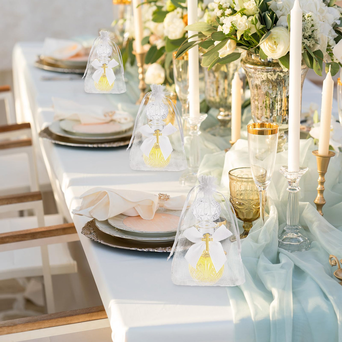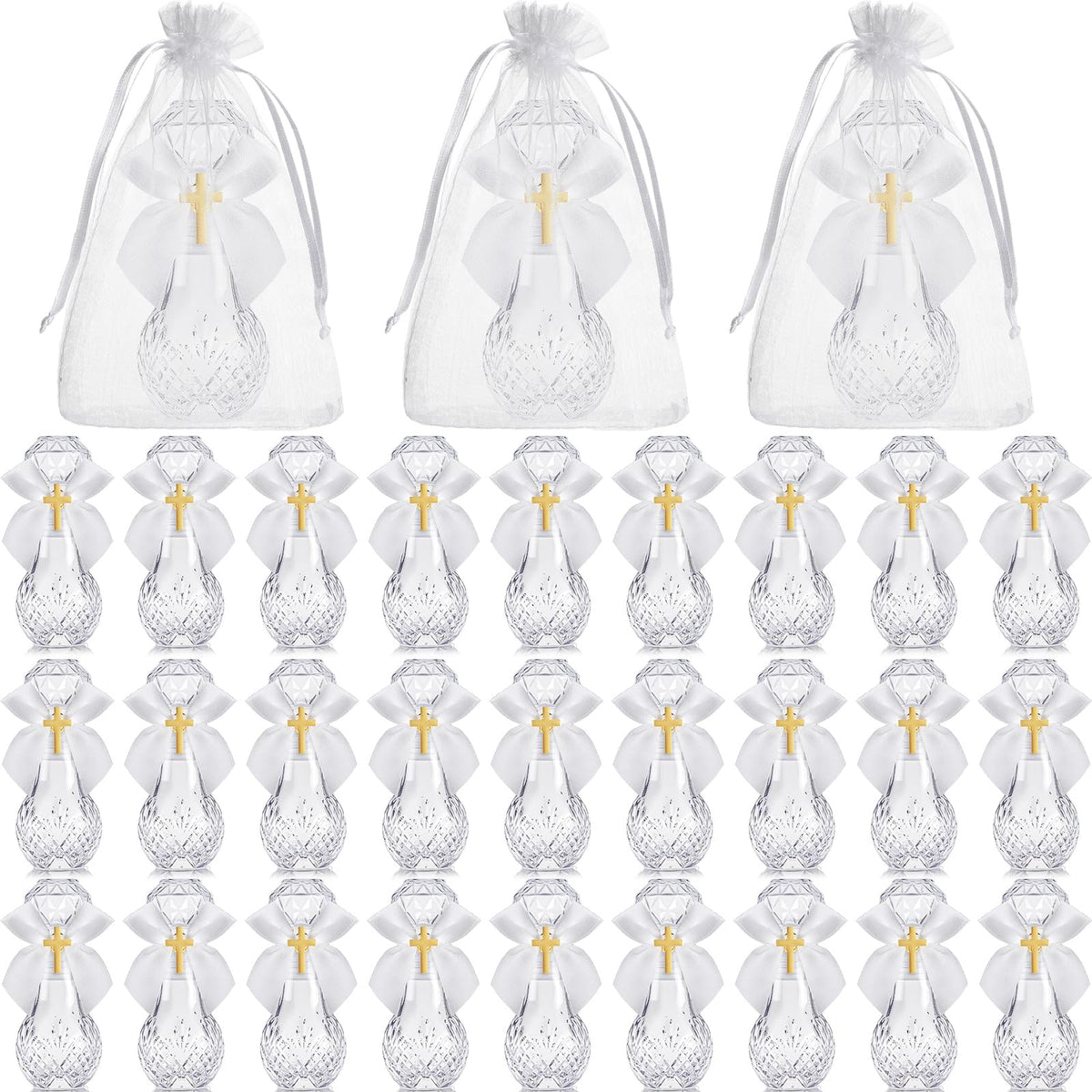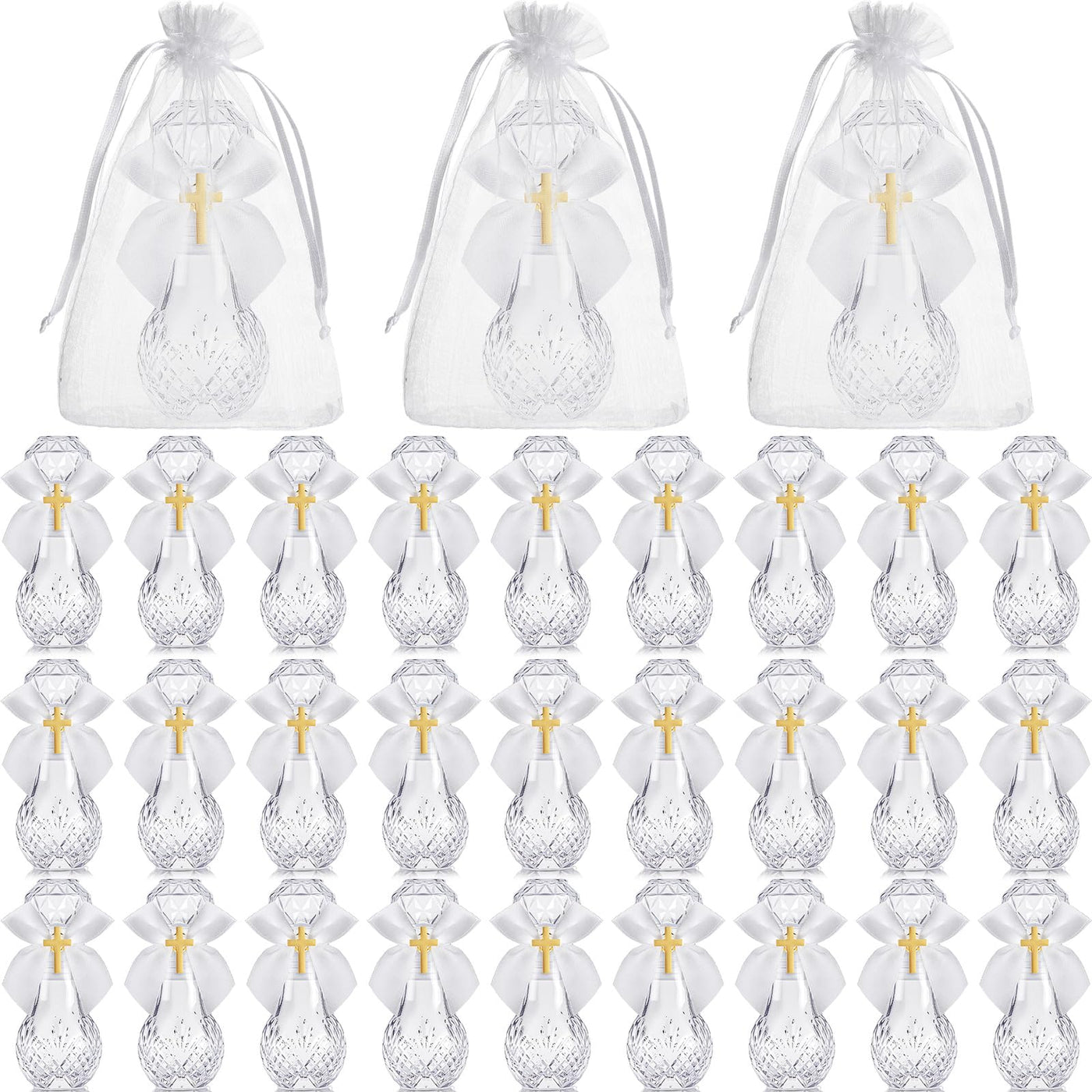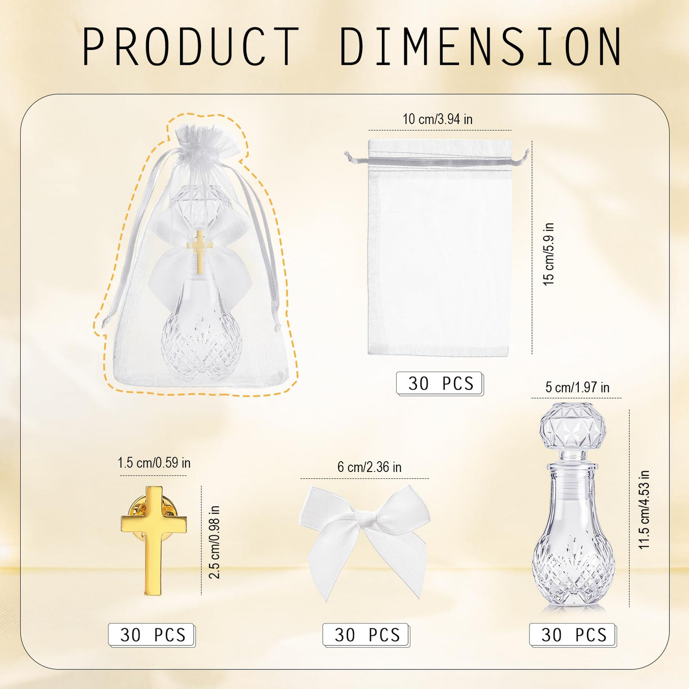 Features: The holy bottle is sturdy and reusable, easy to clean, can serve as a decoration placed where you want. This holy bottle's stylish design, mainly intended for gifting, exudes a touch of elegance and sophistication, suitable for gifting your loved ones Specifications: Material: Holy catholic water bottles: glass Color: Holy catholic water bottles: transparent Cross pins: gold Ribbon bows: white Organza bags: white Size: Holy catholic water bottles: about 1.97 x 4.53 inches/ 5 x 11.5 cm(WxH) Ribbon bow: about 2.36 x 2.36 inches/ 6 x 6 cm(LxW) Organza bags: about 3.94 x 5.91 inches/ 10 x 15 cm(LxW) Package includes: 30 x Holy catholic water bottles, 30 x Cross pins 30 x Ribbon bows, 30 x Organza bags Notes: Manual measurement, please allow slight errors on size. The color may exist a slight difference due to different screen displays.
