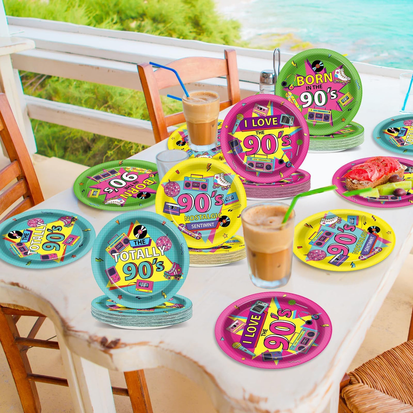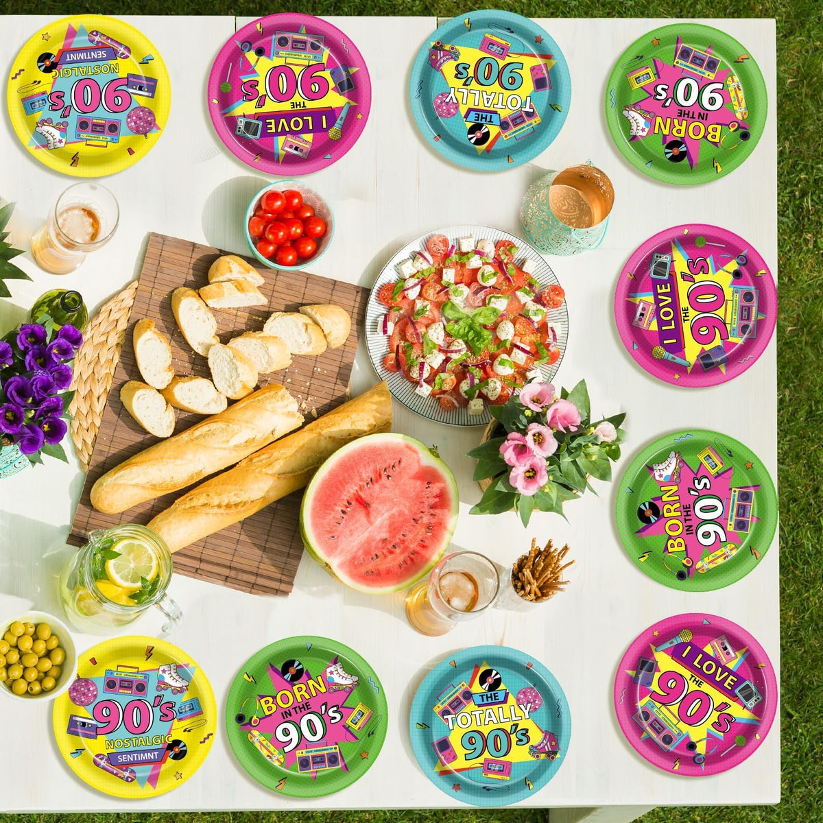 - Q: What is included in the 90's Birthday Party Paper Plates set? A: The set includes 48 pieces of 7-inch paper plates featuring 4 different colorful designs inspired by the 90's theme.