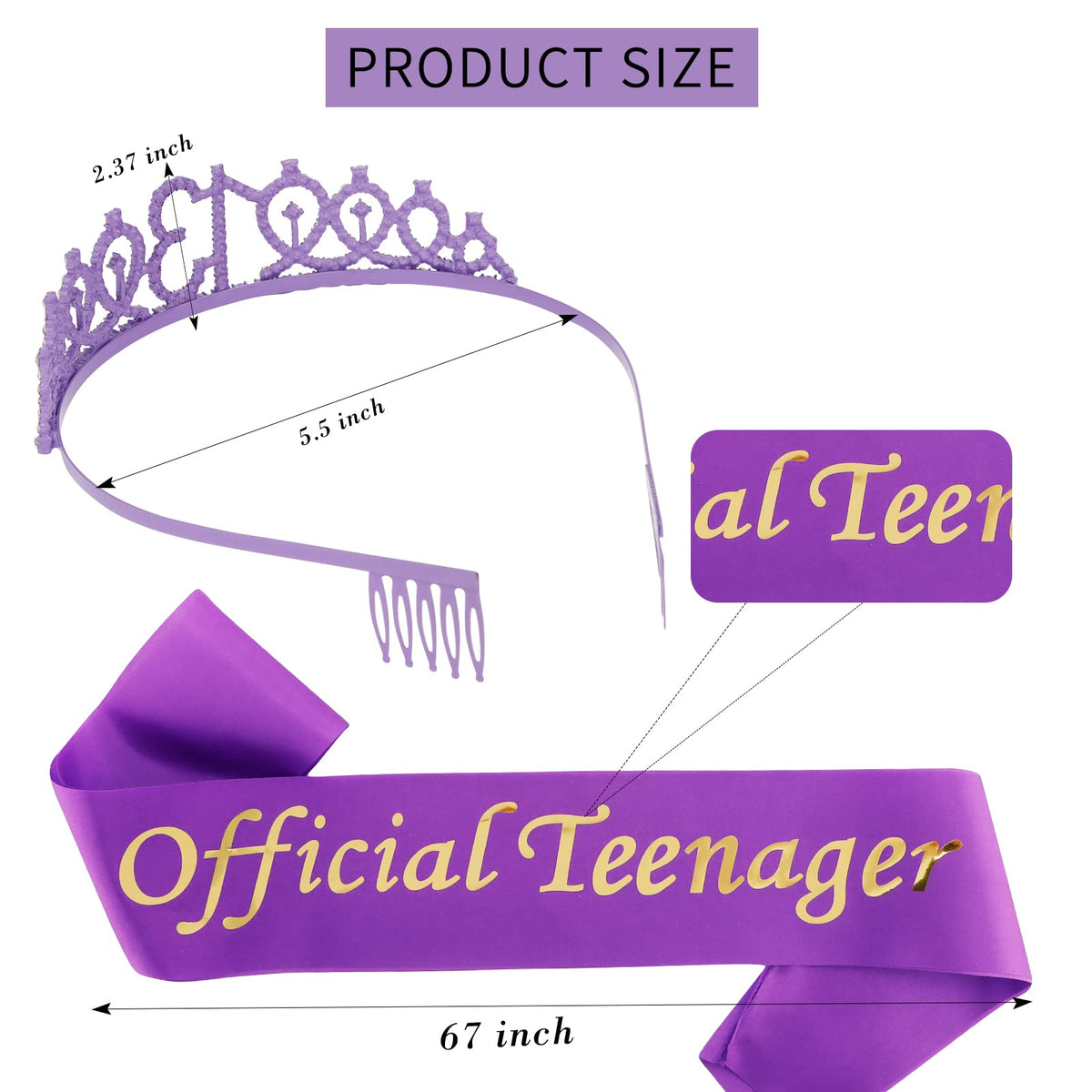 - Q: What is included in the CIEHER Purple 13th Birthday Crown and Sash Set? A: The set includes an 'Official Teenager' purple birthday sash made from soft satin fabric and a rhinestone tiara.