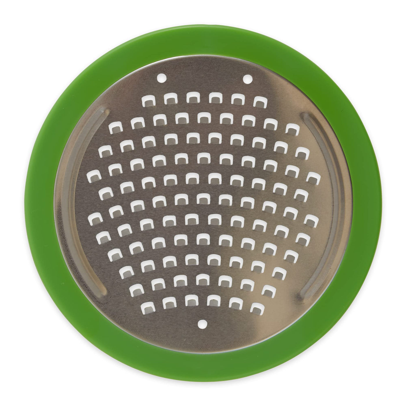 • Q: How does the airtight container work for storing cut citrus? A: To store cut citrus, simply remove the grater disc, place the cut end of the fruit on the textured side of the yellow lid, then cover it with the clear container and turn to lock, keeping it fresh longer.