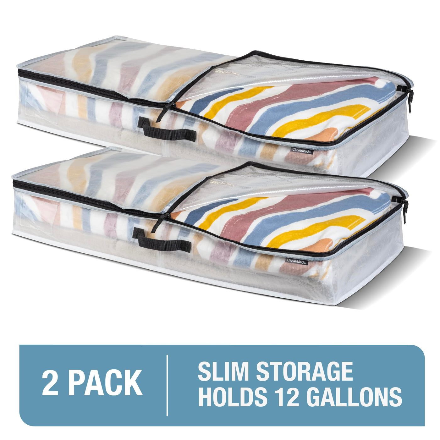 • Q: What are the dimensions of the CleverMade Under Bed Storage Bag? A: The CleverMade Under Bed Storage Bag measures 33 inches long, 17 inches wide, and 5 inches high when opened.