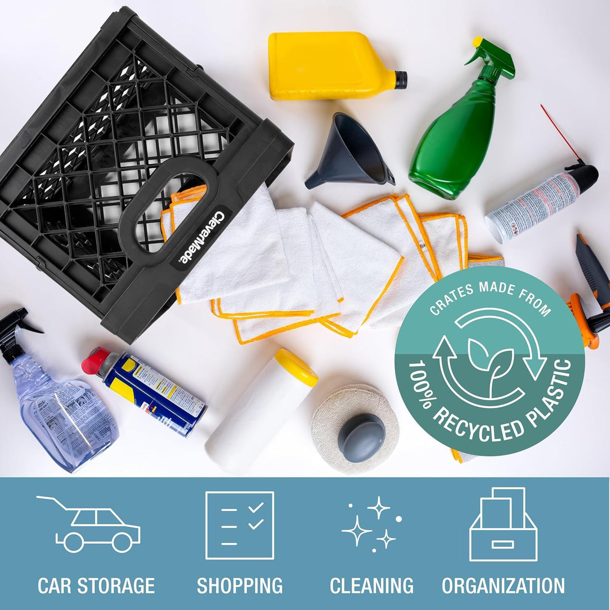 • Q: What is the material of these storage bins? A: The CleverMade Collapsible Milk Crates are made from 37% recycled plastic and 63% polypropylene regrind.