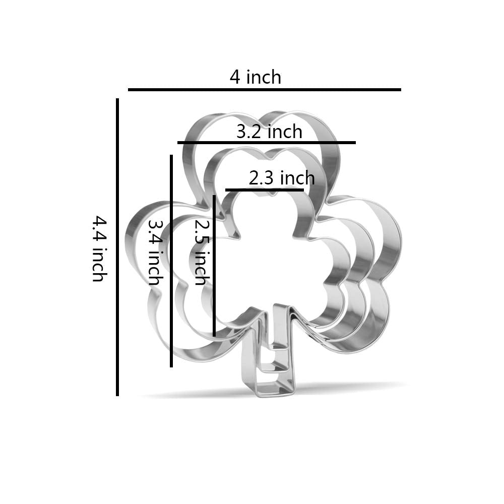 • Q: What sizes are included in the Clover Cookie Cutter Set? A: The Clover Cookie Cutter Set includes three sizes: Large Clover measuring 4.4 inches tall by 4.2 inches wide, Medium Clover measuring 3.4 inches tall by 3.2 inches wide, and Small Clover measuring 2.5 inches tall by 2.3 inches wide.
