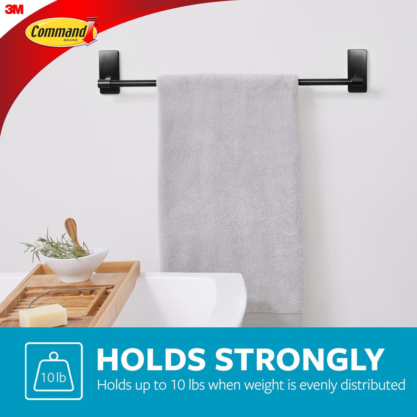 • Q: How much weight can the Command Bath Towel Bar hold? A: The Command Bath Towel Bar can hold up to 10 pounds when the weight is evenly distributed.