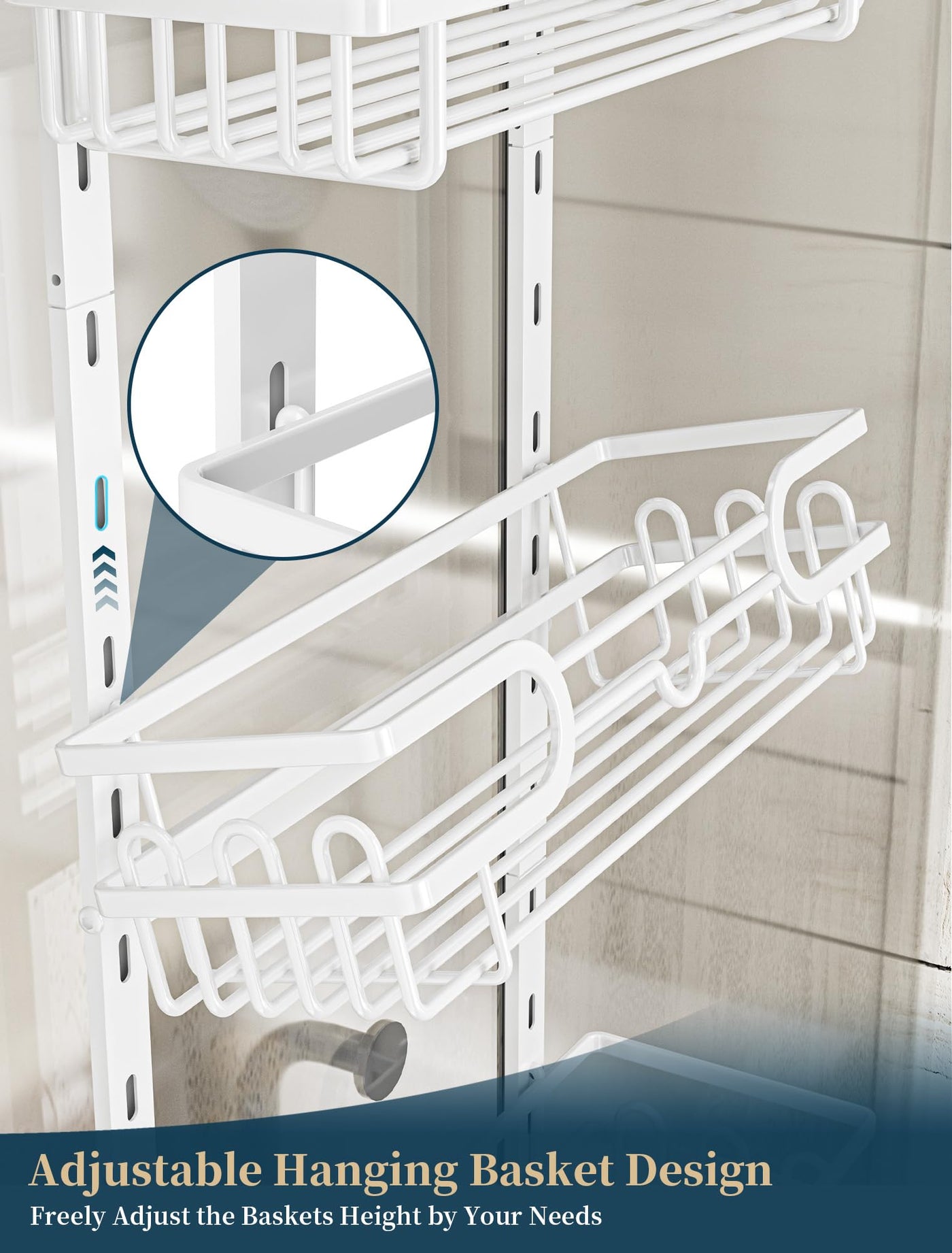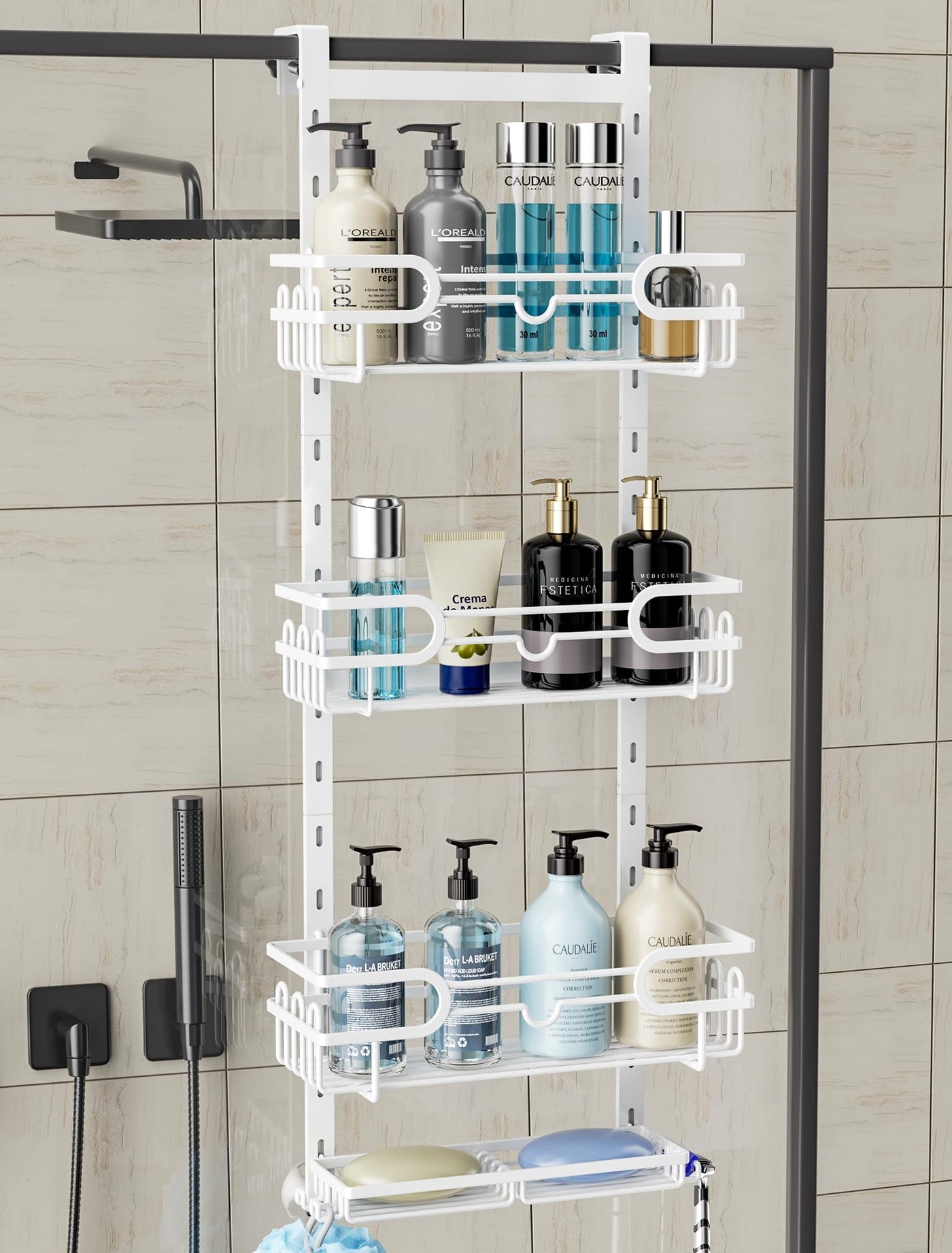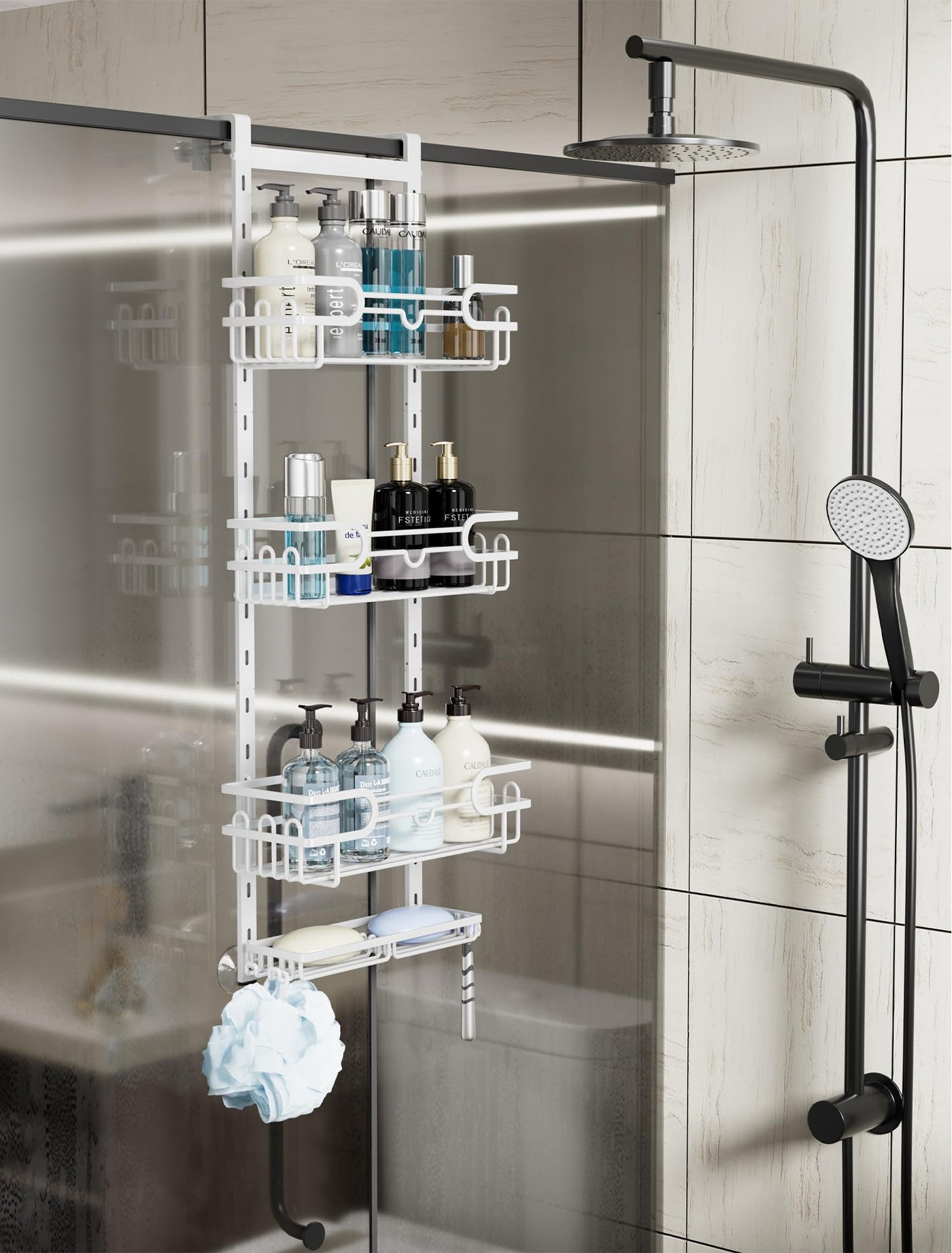 - Q: How many shelves does the shower organizer have? A: The Consumest Over The Door Shower Caddy features four height-adjustable shelves.