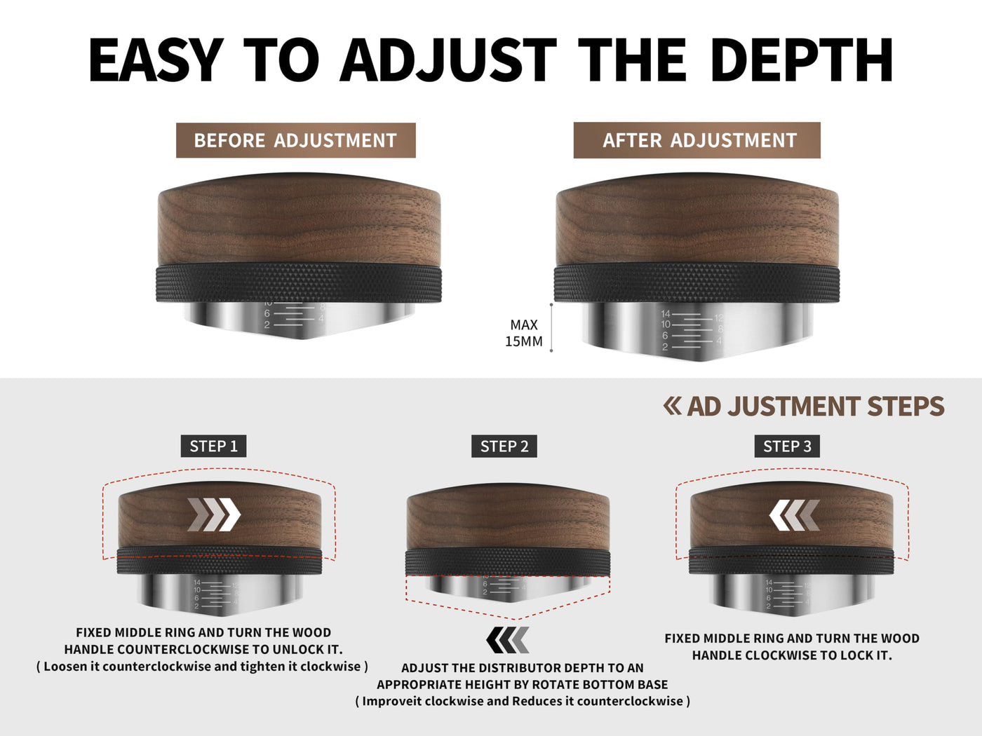 - Q: How can I adjust the depth of the espresso distributor? A: The depth of the espresso distributor can be easily adjusted without the need for screws, washers, or wrenches, allowing you to set the height according to your needs.