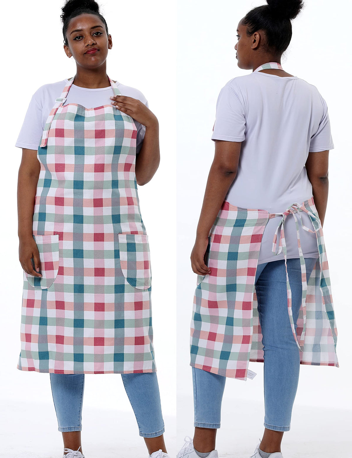 • Q: What color options are available for the aprons? A: The aprons are available in a pink grid pattern.