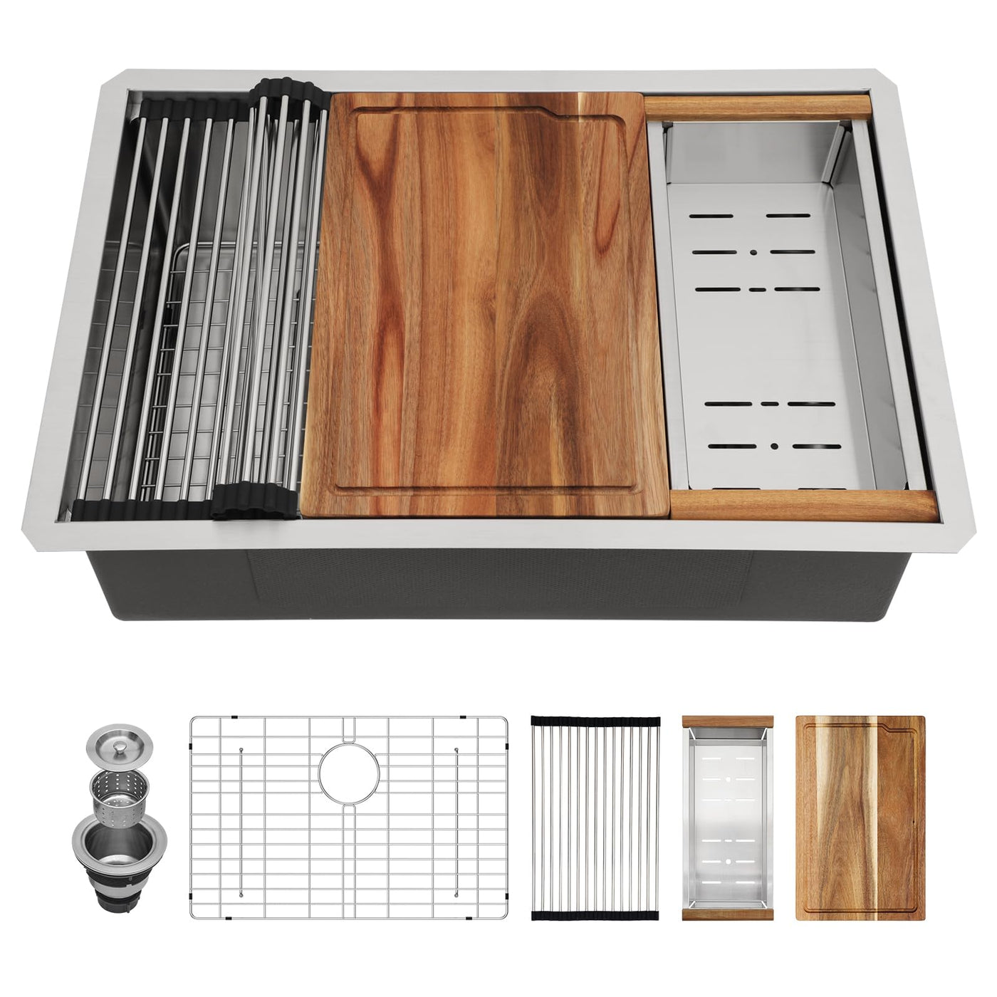 Couoko 27 Inch Undermount Workstation Kitchen Sink 27X19 Stainless Steel 16 Gauge Undermount Sink Deep Single Bowl Handmade Unde