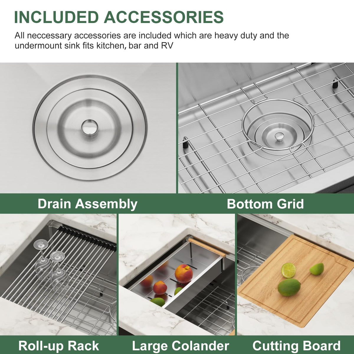 - Q: Does the sink come with accessories? A: Yes, the sink includes a roll-up drying rack, T304 stainless steel bottom grid, a basket strainer for filtering, and a cutting board.