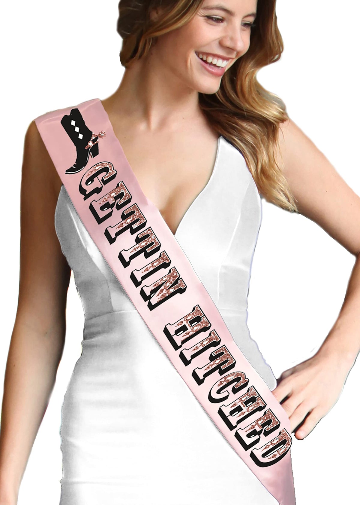 • Q: What is the design of the sash? A: The sash features fun gold foil lettering that says 'Bride’s Posse' and 'Gettin’ Hitched', adding a lovely touch to any celebration.