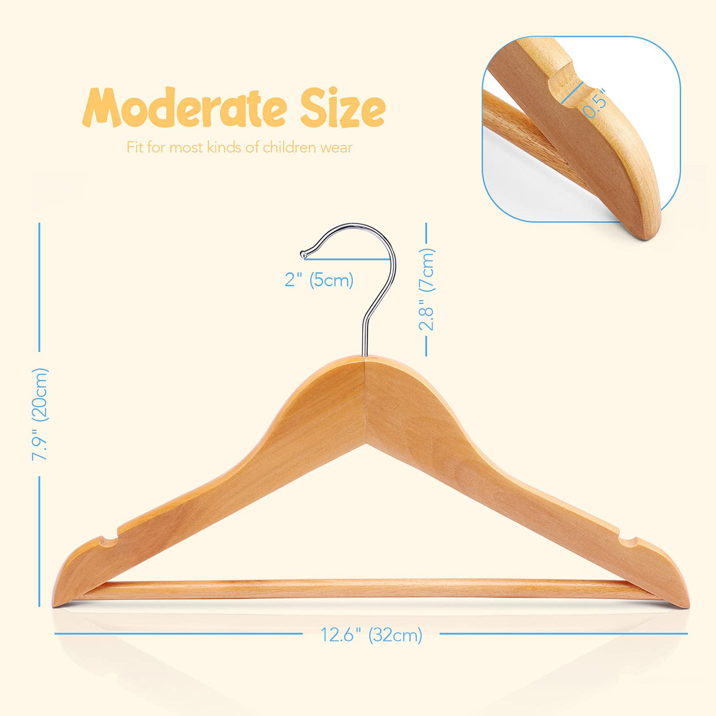 - Q: What is the weight capacity of each hanger? A: While specific weight capacity details are not provided, these sturdy wooden hangers are designed to hold typical children's clothing without bending or breaking.