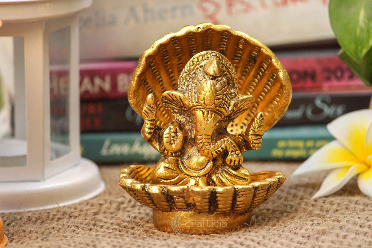 Crafticia Metal Lord Ganesh Statue Sitting In Seep Ganesha For Puja Showpiece (8 X 8 X 8.5 Cm, Golden), Gold, Medium
