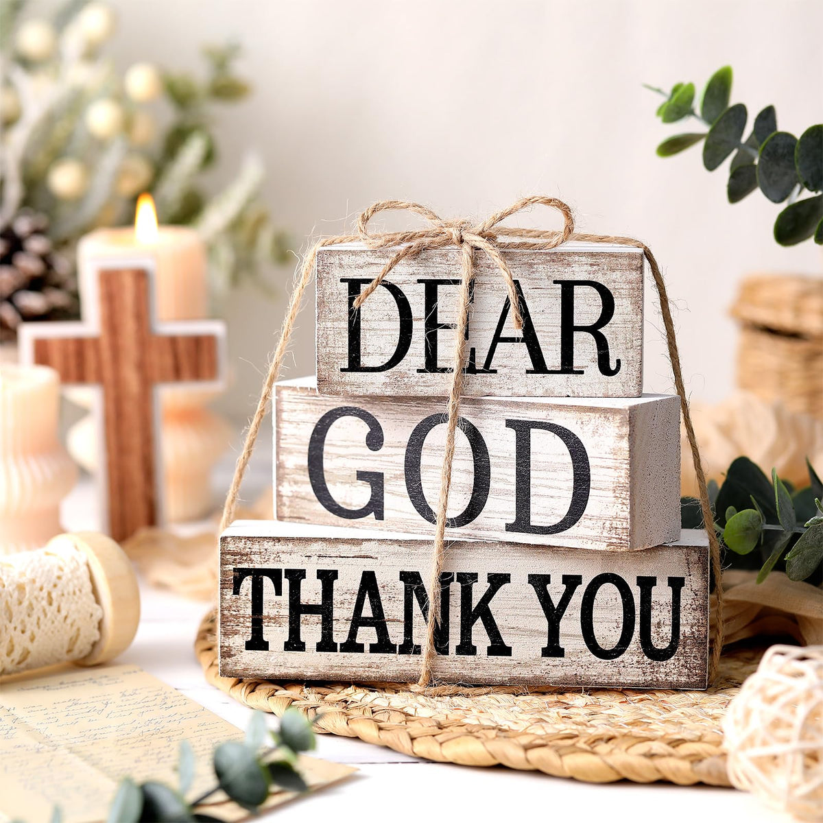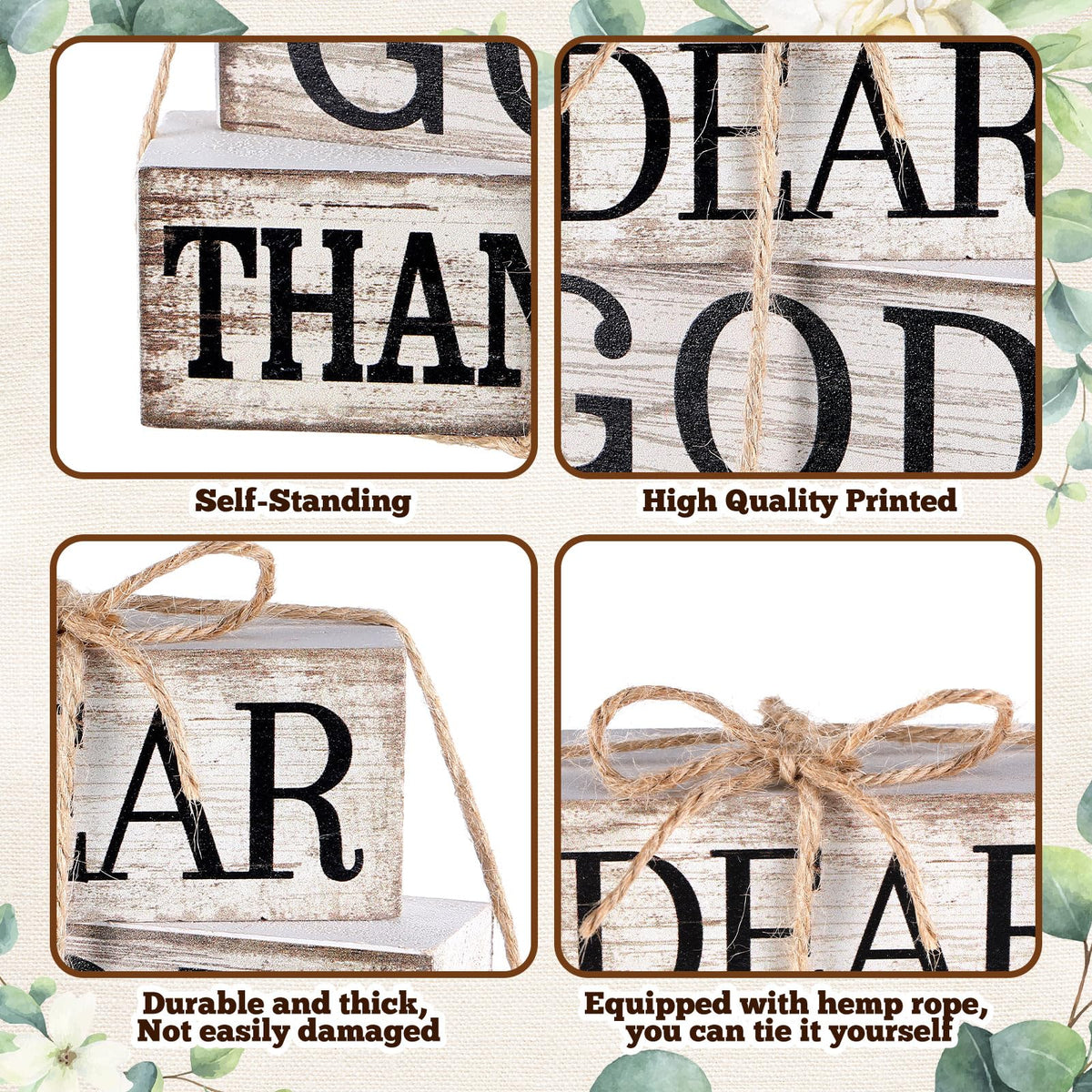 CroBlissful 4 Pcs Farmhouse Wooden Tabletop Decor Inspirational Christian Table Sign Bible Verse Wooden Decor Dear God Thank You