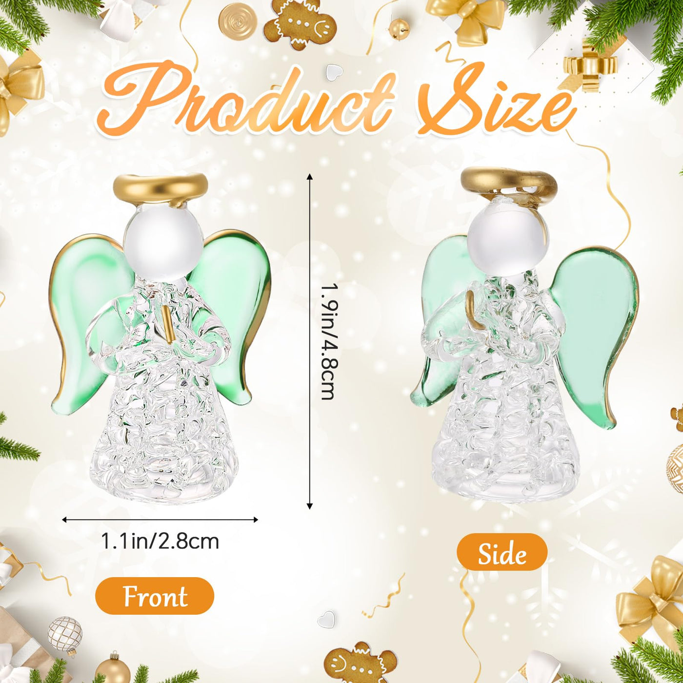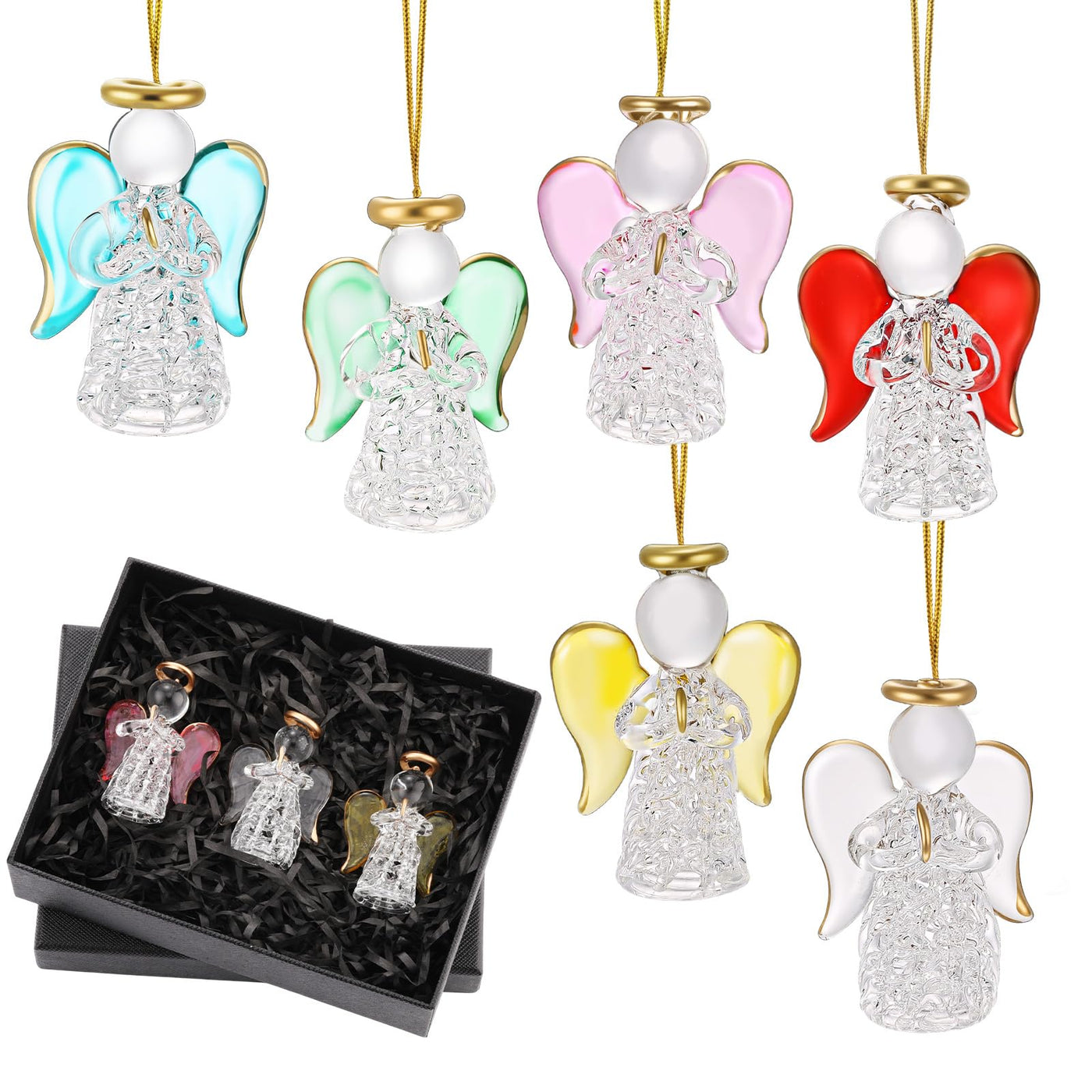 Features: The convenient hanging feature lets you quickly incorporate these glass angel ornaments into your festive decor, wherever you choose, creating a blissful ambiance. The symbolism of longing and companionship resonates with the season's sentiments, making this hanging angel decor an ideal gift choice for your loved ones. Add this timeless, enchanting piece to your holiday decoration or gift it to spread the joy. Specifications: Material: glass Color: blue, pink, clear, yellow, red and green Size: about 3.3 x 2.2 inches/ 8.5 x 5.6 cm Package includes: 6 x Guardian angel with gift box Notes: Manual measurement, please allow slight errors on size. The color may exist a slight difference due to different screen displays