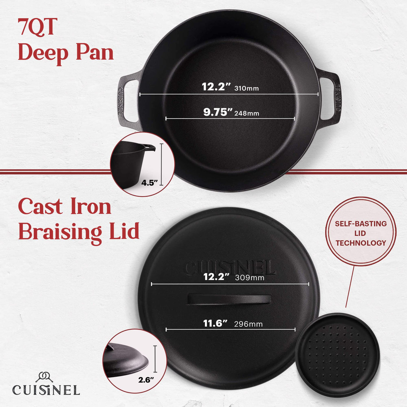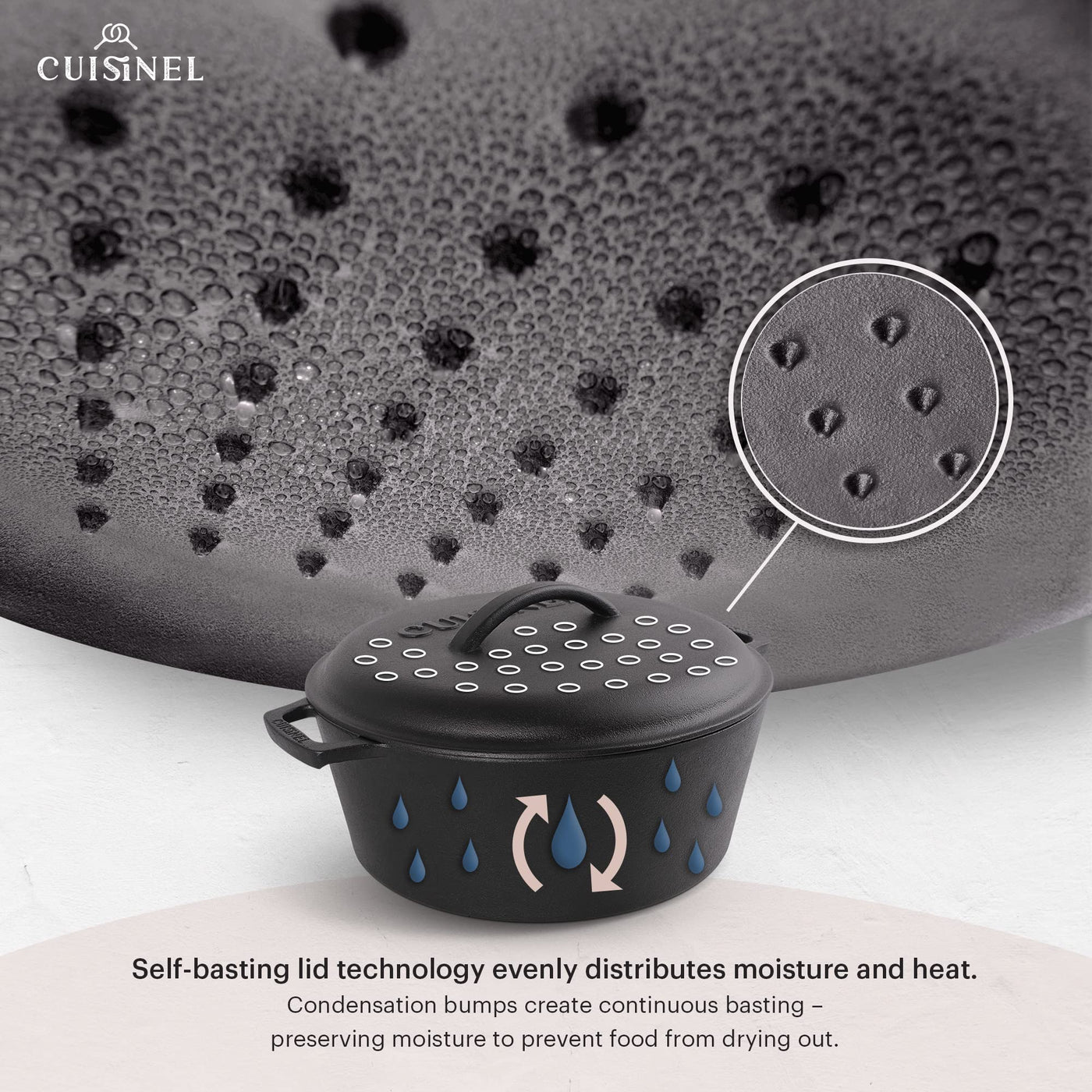 • Q: What is the capacity of the Cuisinel Cast Iron Dutch Oven? A: The Cuisinel Cast Iron Dutch Oven has a capacity of 7 quarts, making it ideal for cooking large meals.