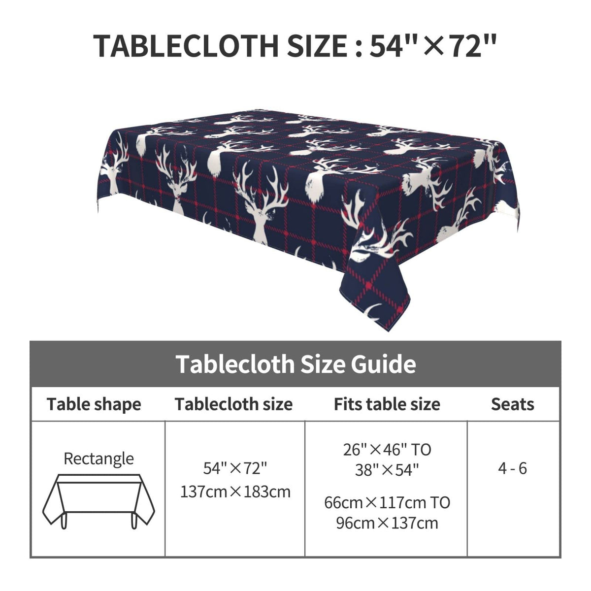 - Q: What are the dimensions of the tablecloth? A: The tablecloth measures 54 inches by 72 inches, making it suitable for rectangular tables.