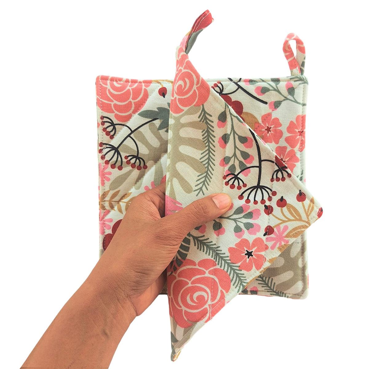 - Q: Do the pot holders feature any specific design? A: Yes, the pot holders come in a classic pink color with a lovely floral pattern.