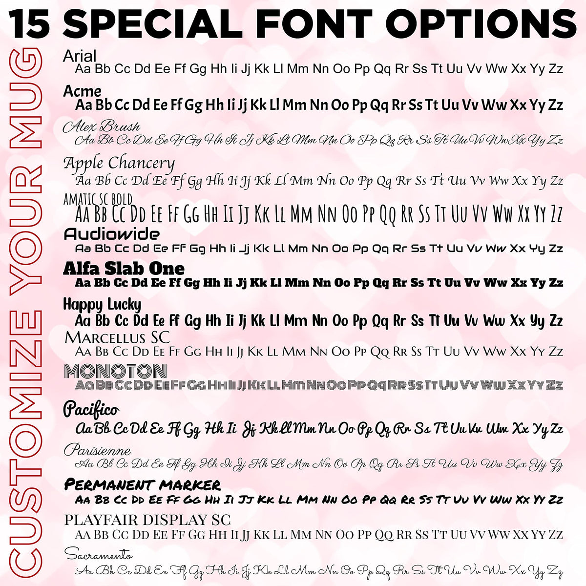 - Q: What font options are available for customization? A: There are 15 font options available for you to choose from when customizing your mug.