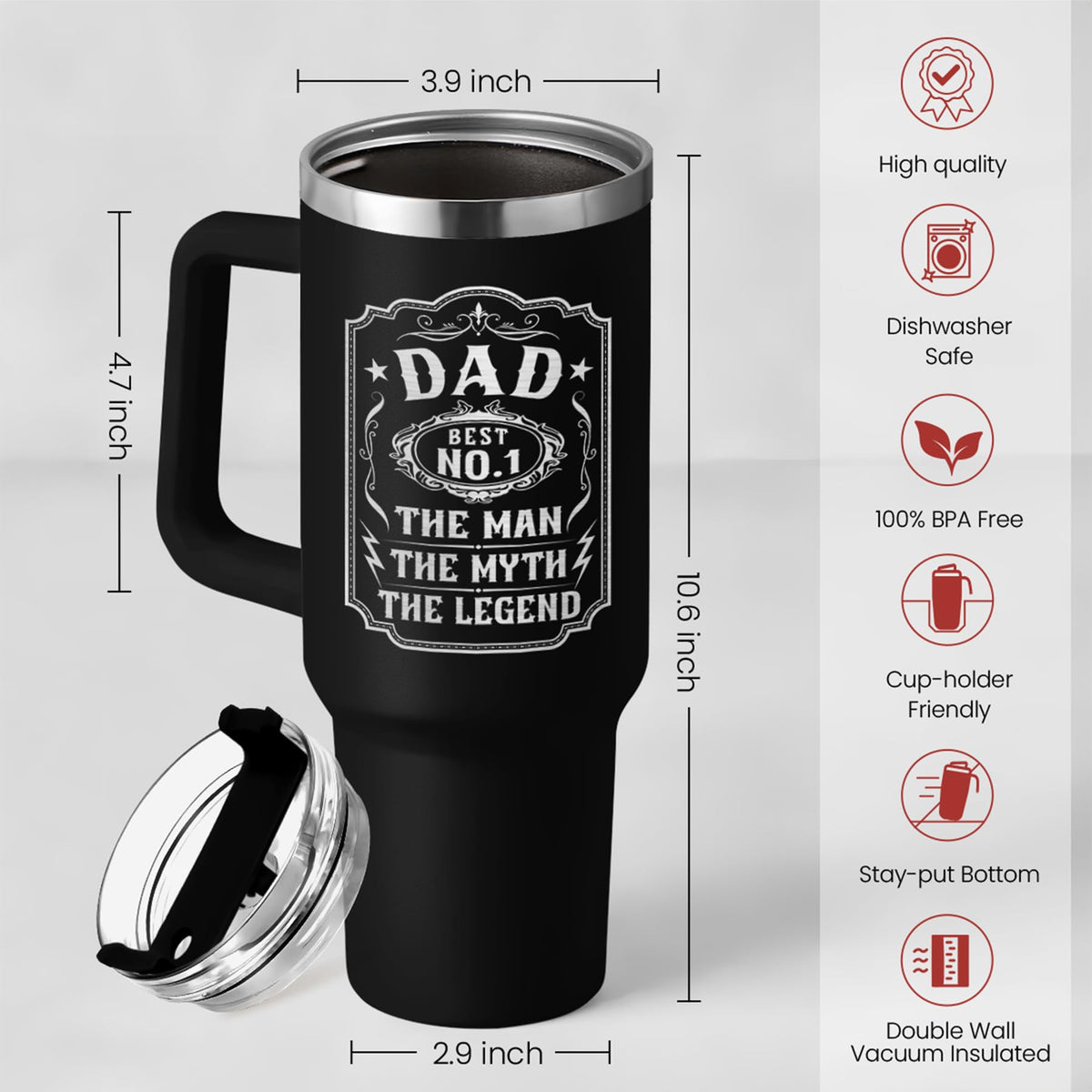 • Q: What is the capacity of the Dad 40 oz tumbler? A: The Dad 40 oz tumbler has a capacity of 40 ounces, making it large enough to hold plenty of your favorite beverages.