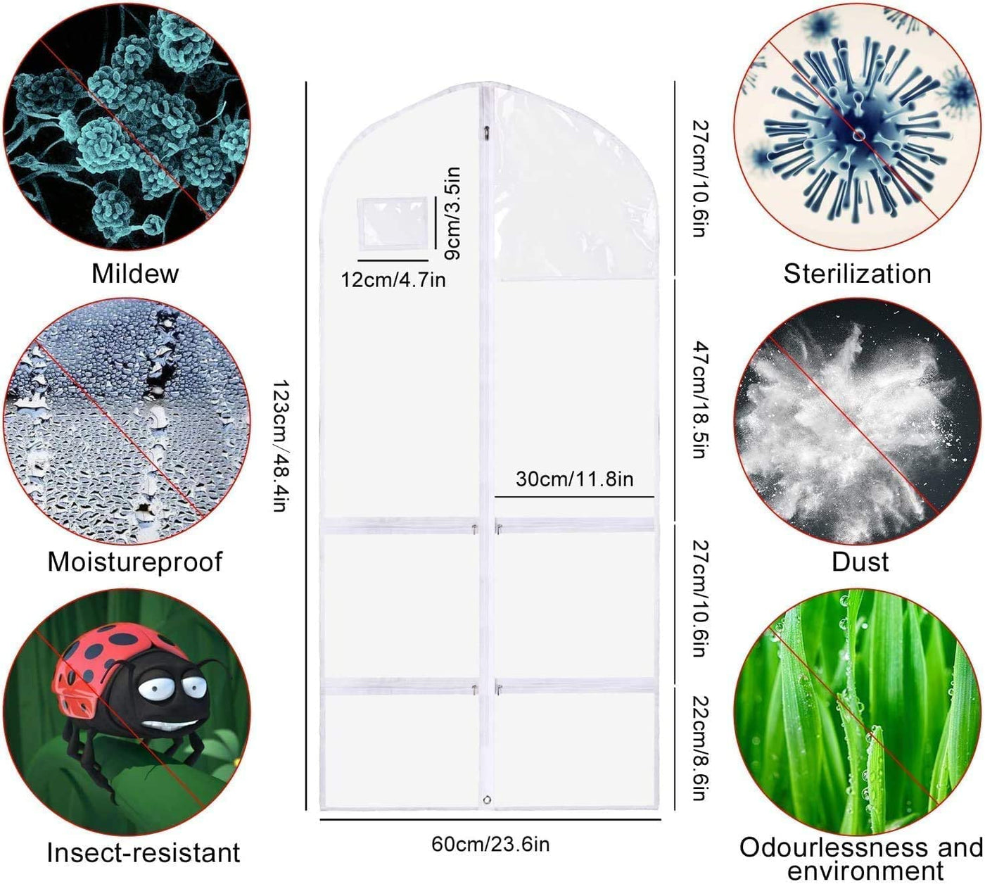 - Q: What materials are used in the garment bag? A: The garment bag is made from high-quality PVC, which is durable, soft, dustproof, waterproof, anti-static, and easy to clean.