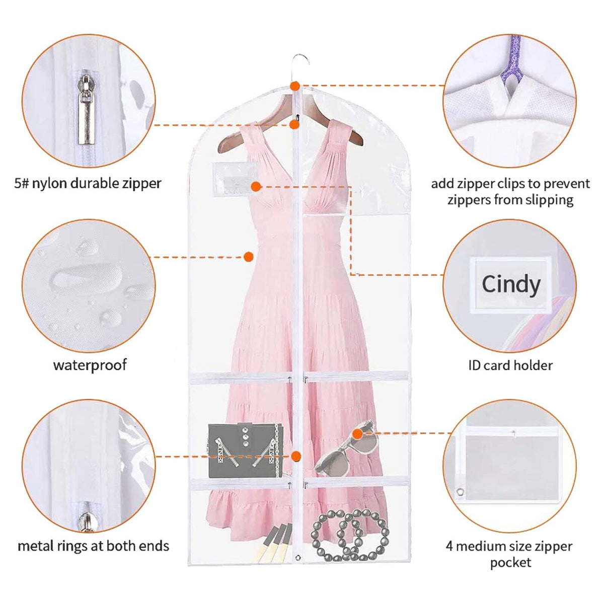 - Q: Does the garment bag have storage pockets? A: Yes, it features four large clear zipper pockets for storing shoes and accessories such as belts, glasses, and makeup.