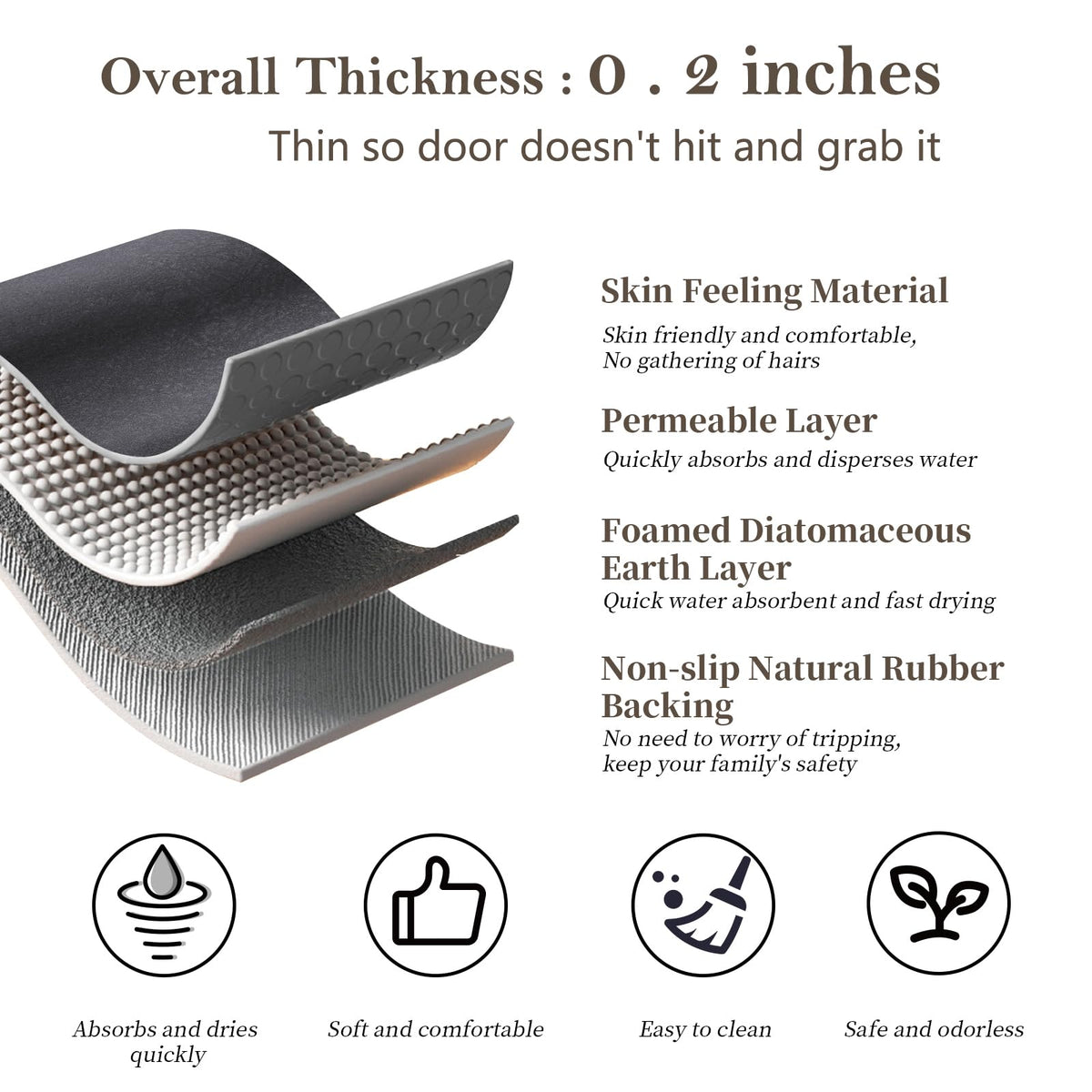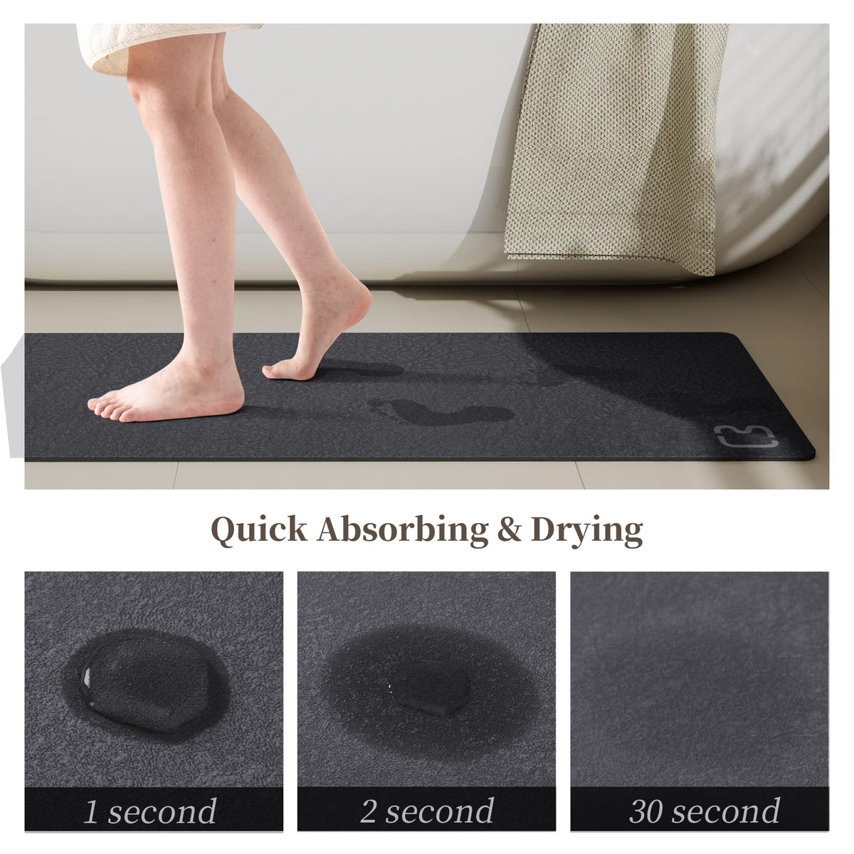 - Q: Does this bath mat absorb water quickly? A: Yes, the bath mat is designed to absorb water from wet feet immediately, and watermarks will typically disappear within a few minutes.
