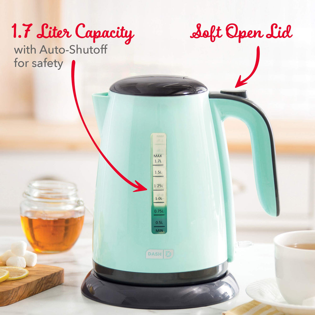 - Q: What is the capacity of the Dash Easy Electric Kettle? A: The Dash Easy Electric Kettle has a maximum capacity of 57 ounces, which is approximately 1.7 liters.