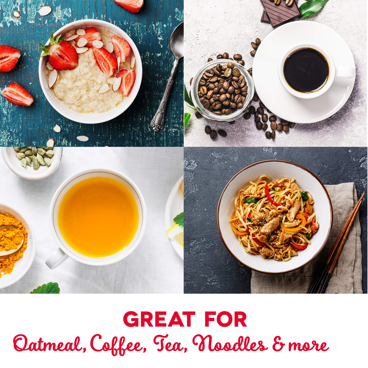 - Q: What types of beverages can I make with this kettle? A: You can use the kettle to boil water for tea, coffee, instant soups, oatmeal, and more.