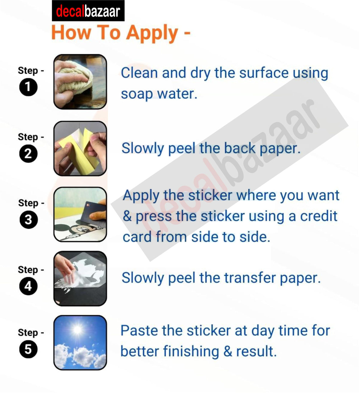 Shop wide range of collection of sticker decal from the house of decalbazaar on online and ofline. Amazing assortment of sticker decals. Easy installation the surface you wish to attach your decal must be clean and free from dust, grease or any other contamination. Stickers are made up of vinyl which is durable for longtime. Sticker decals are best gift for your family and friends to decoration gift. Proper decal care starts at the installation process. Before you install a decal, you will want to make sure that you adequately clean the surface you are placing your decal on. If the surface wont clean, the decal wont stick as well. Additionally, any dirt left behind can cause the decal to have spots or bumps that take away from the attractive graphics. After pasting the sticker, gently remove the transfer tape installed in your wall. After pasting the sticker, gently remove the transfer tape that is installed in your wall, vehicle, tile etc.