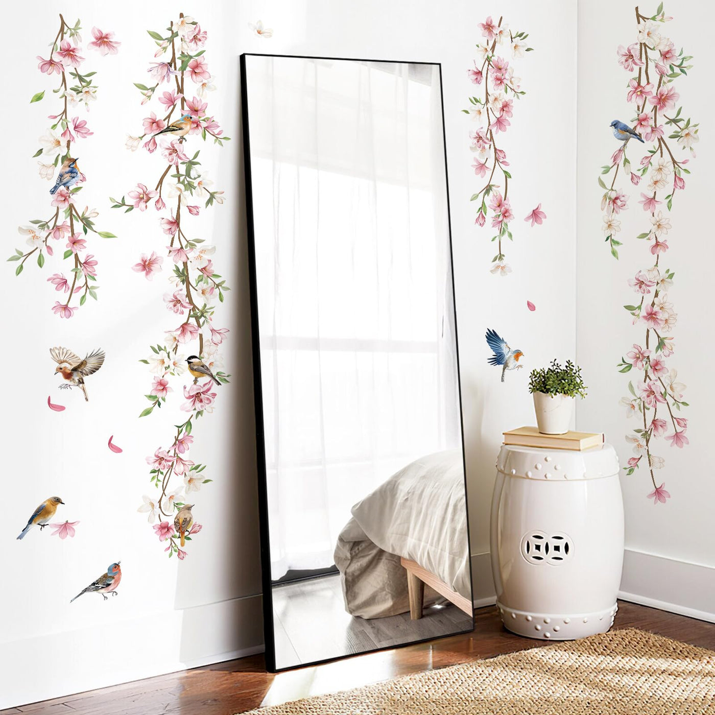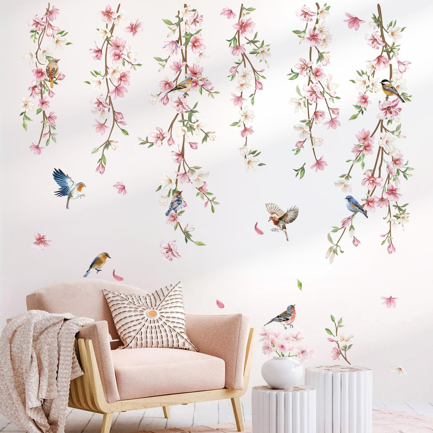 Decalmile Hanging Flower Vine Wall Decals Pink Floral Leaves Birds Wall Stickers Bedroom Living Room Sofa Tv Background Wall Dec