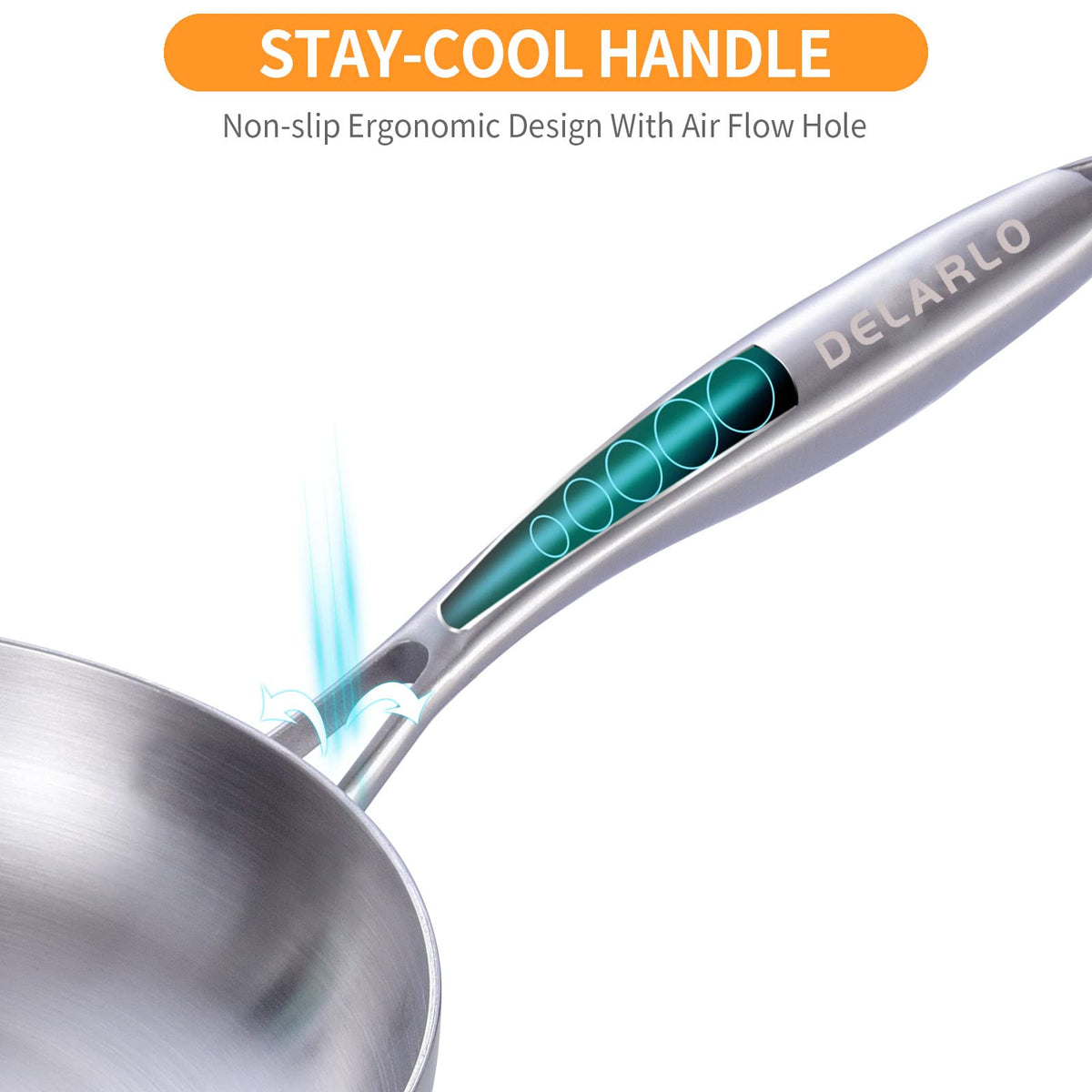• Q: What materials are used in the DELARLO frying pan? A: The DELARLO frying pan is made from high-quality stainless steel, ensuring durability and resistance to wear.