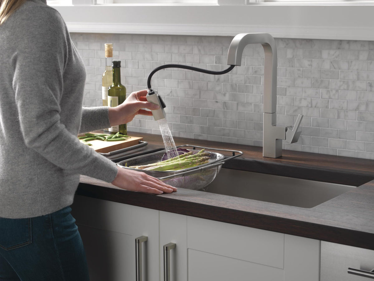 • Q: Can the sprayer toggle between spray and stream modes? A: Yes, the dual function sprayer on the Delta Junction Faucet allows you to easily switch between spray and stream modes, providing versatility for various kitchen tasks.