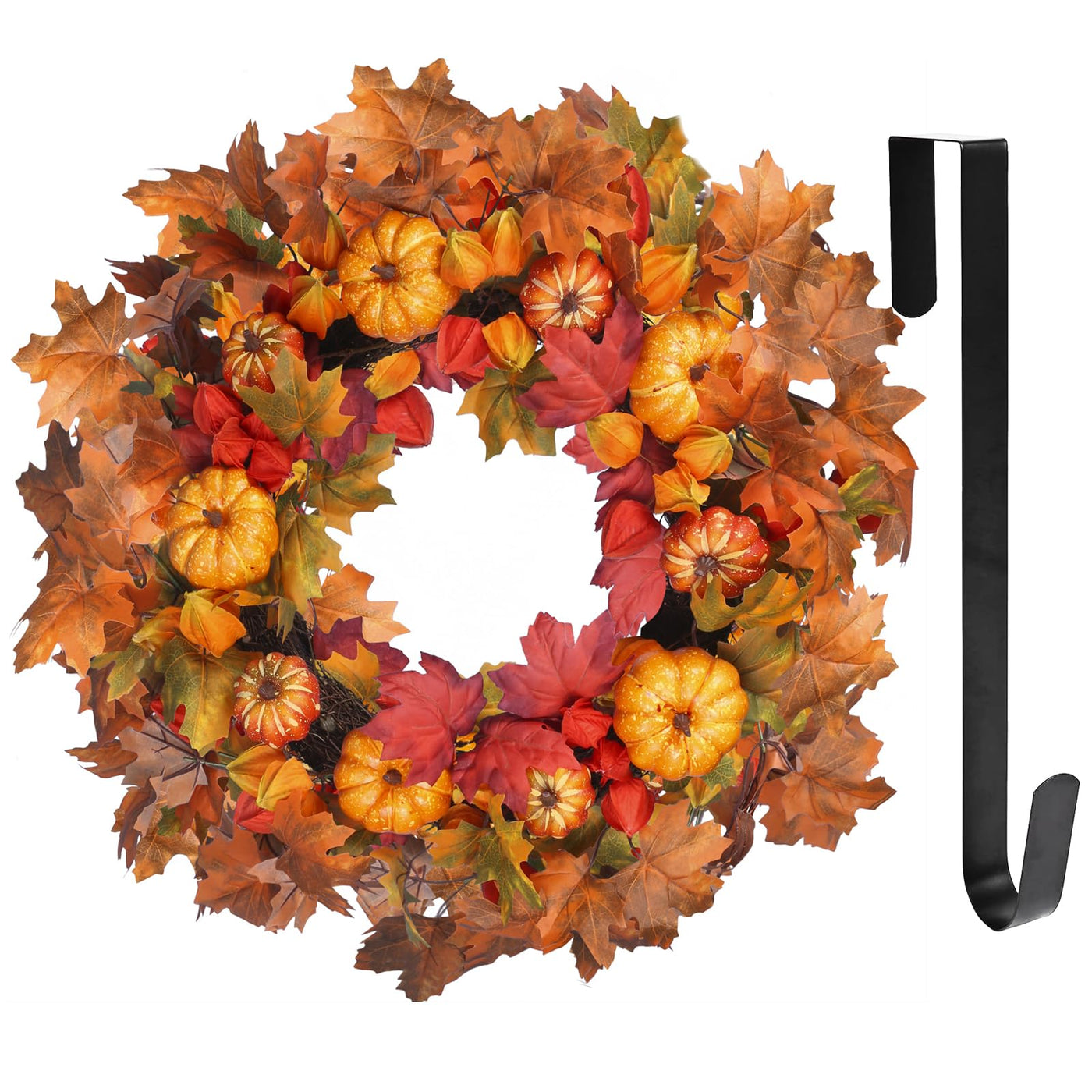 Large Size Fall Wreath: At 24 inch, fall wreath for front door makes a bold statement, creating an eye-catching display whether hung on your front door, over a fireplace, or as a centerpiece. Its large size ensures it stands out, making it a focal point of your fall decor | Vibrant Variety of Materials: Our autumn wreaths draw inspiration from the natural elements of the American fall season. Fall wreaths include the distinctive red, orange, and yellow leaves of autumn, mini pumpkins, Red Lantern Fruit. Each material is meticulously chosen to ensure the highest standards of color, shape, and textu. | Handcrafted Durability: Each Artificial Autumn wreath is meticulously handmade using expert weaving techniques, ensuring that every element is securely fastened. This careful craftsmanship makes the wreath exceptionally sturdy and resistant to wear and tear | Complimentary Autumn Branch: As an added bonus, each 24 inch fall wreaths comes with a special complimentary autumn branch. This exquisite ornament complements the wreaths style perfectly and can be used independently or together with the wreath to infuse even more of the autumn spirit into your home. | Multi-layered Design: Fall wreath front door wreaths go beyond the simplicity of a single-layered decoration. They feature a multi-layered design that cleverly combines different elements, resulting in breathtaking visual effects. Each layer is crafted with attention to detail, making the entire wreath appear exceptionally rich and colorful.