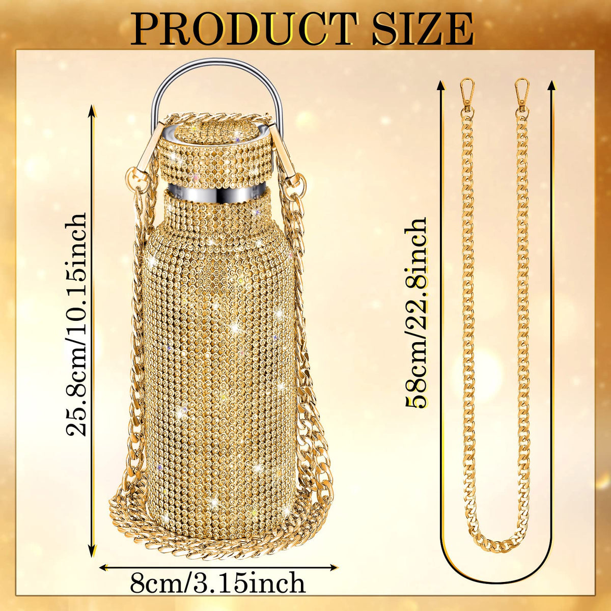 Diamond Water Bottle Bling Rhinestone Stainless Steel Thermal Refillable Insulated Glitter With Chain For Women Girls Gifts (Gol