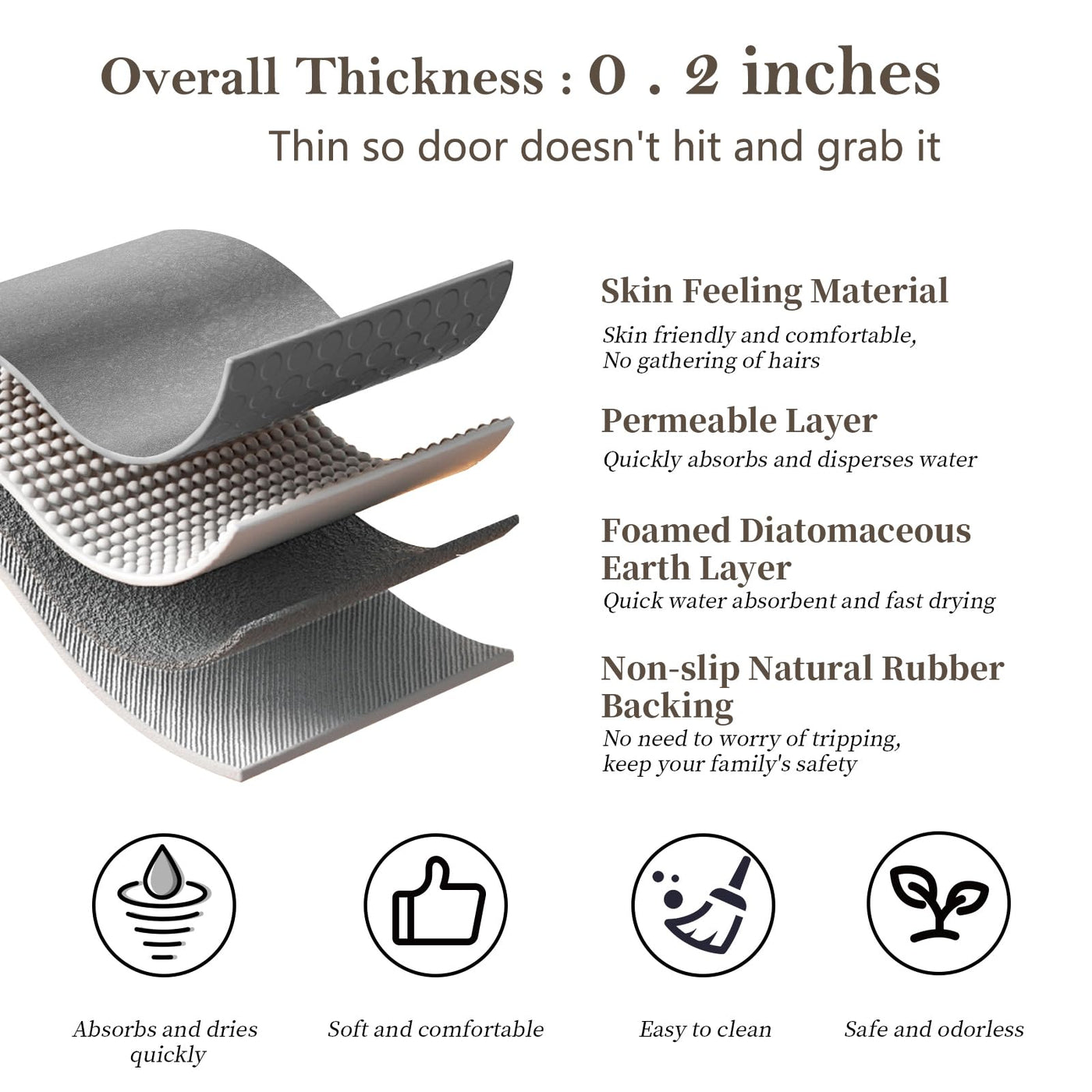 • Q: What materials is the bath mat made from? A: The bath mat features a faux suede surface combined with a diatomaceous earth core, providing both comfort and durability.