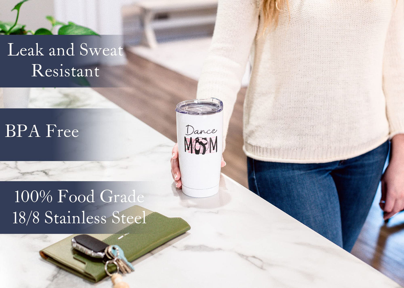 - Q: What design is featured on the tumbler? A: The artwork reads 'Dance Mom' in a trendy font and fun graphic design.