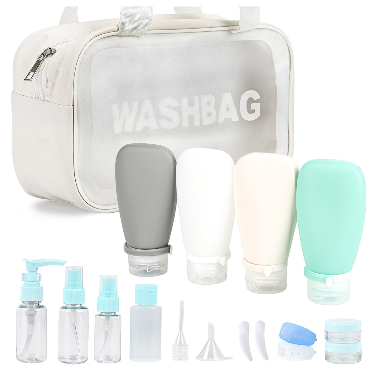 • Q: What is the capacity of the silicone travel bottles? A: The set includes four silicone travel bottles, each with a capacity of 3 oz, which is compliant with TSA liquid restrictions.