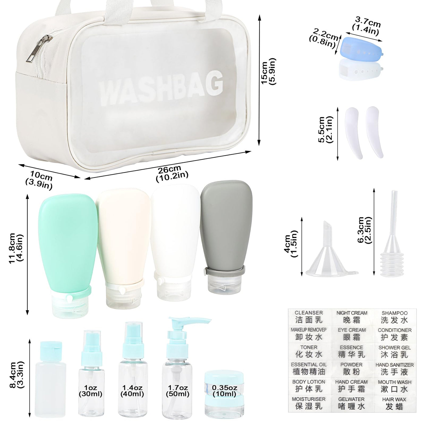 • Q: Do the bottles come with labels? A: Yes, the set includes labels to help you organize and identify the contents of each bottle easily.