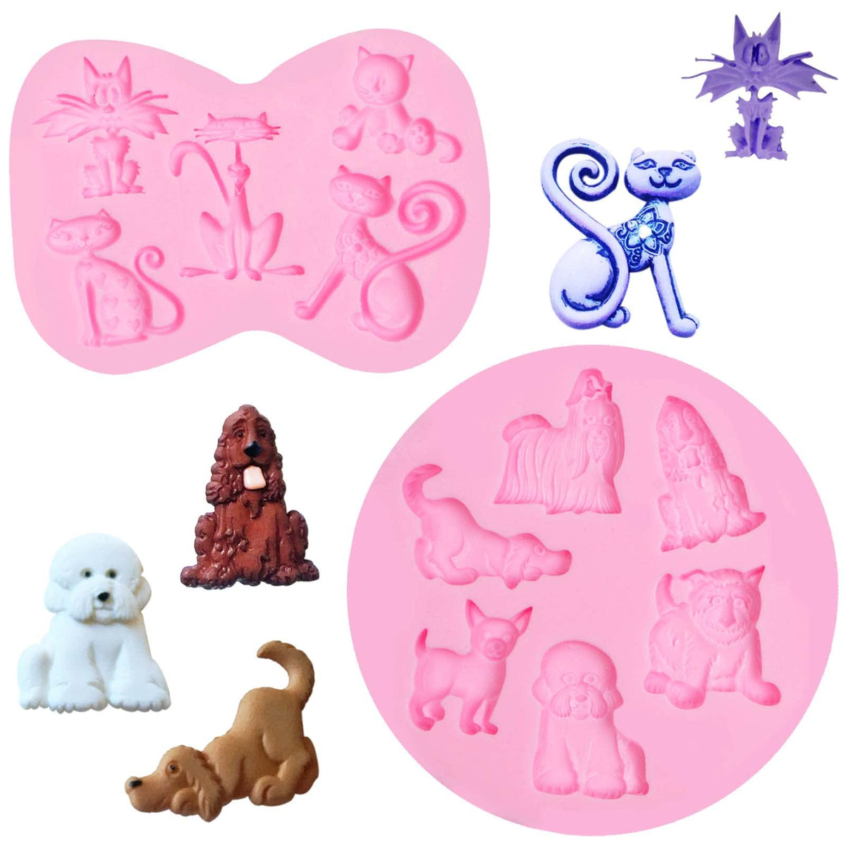 Dog Molds Silicone Fondant, 2 Packs Mini Cute Cats Dogs Fondant Animal Chocolate Molds For Baby Birthday Party Cake Decoration,