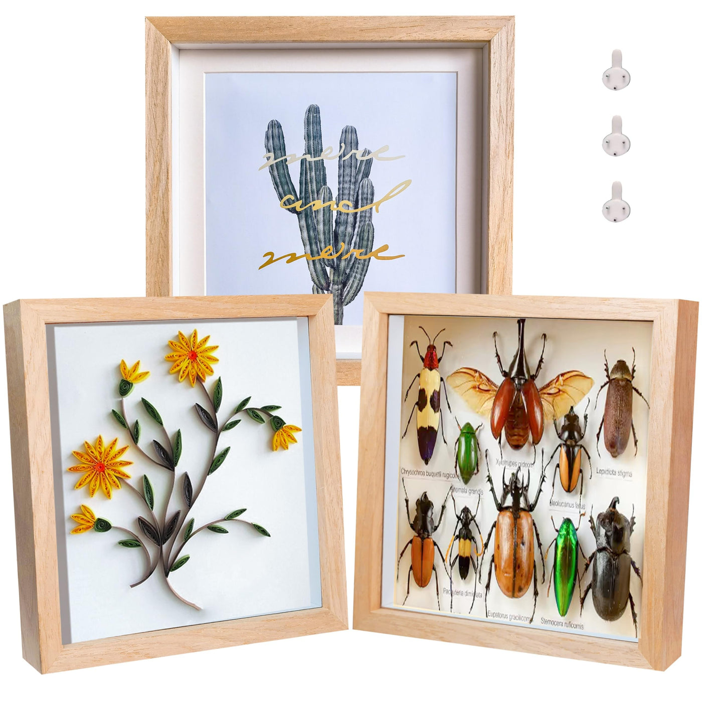 Dohomi 8x8 Shadow Box Frame Natural Wood Shadow Box Display Case 3 Pack Picture Frames Glass Surface Internal Depth 0.6 inch for