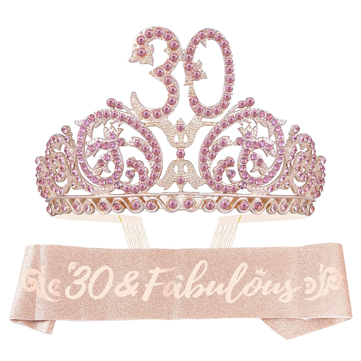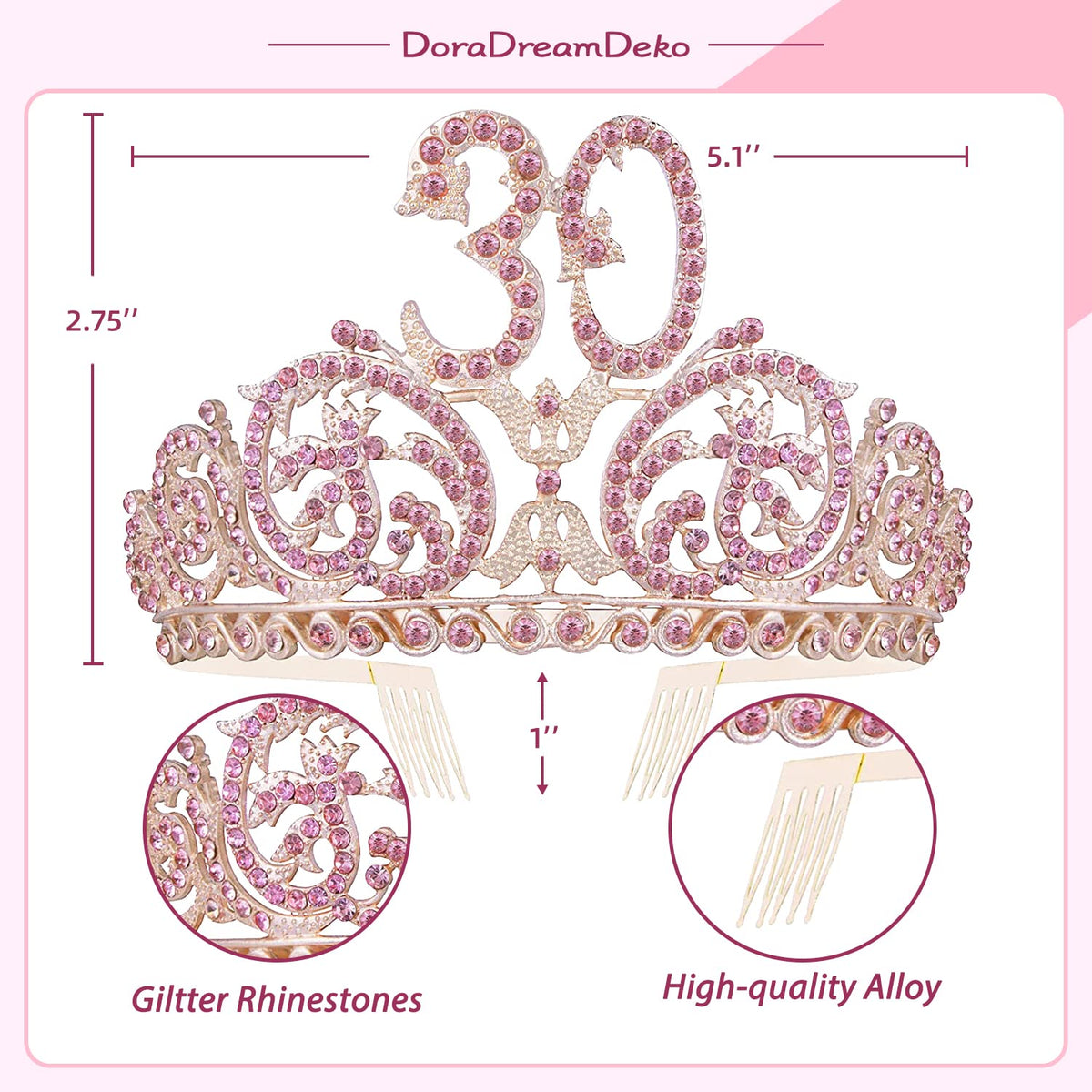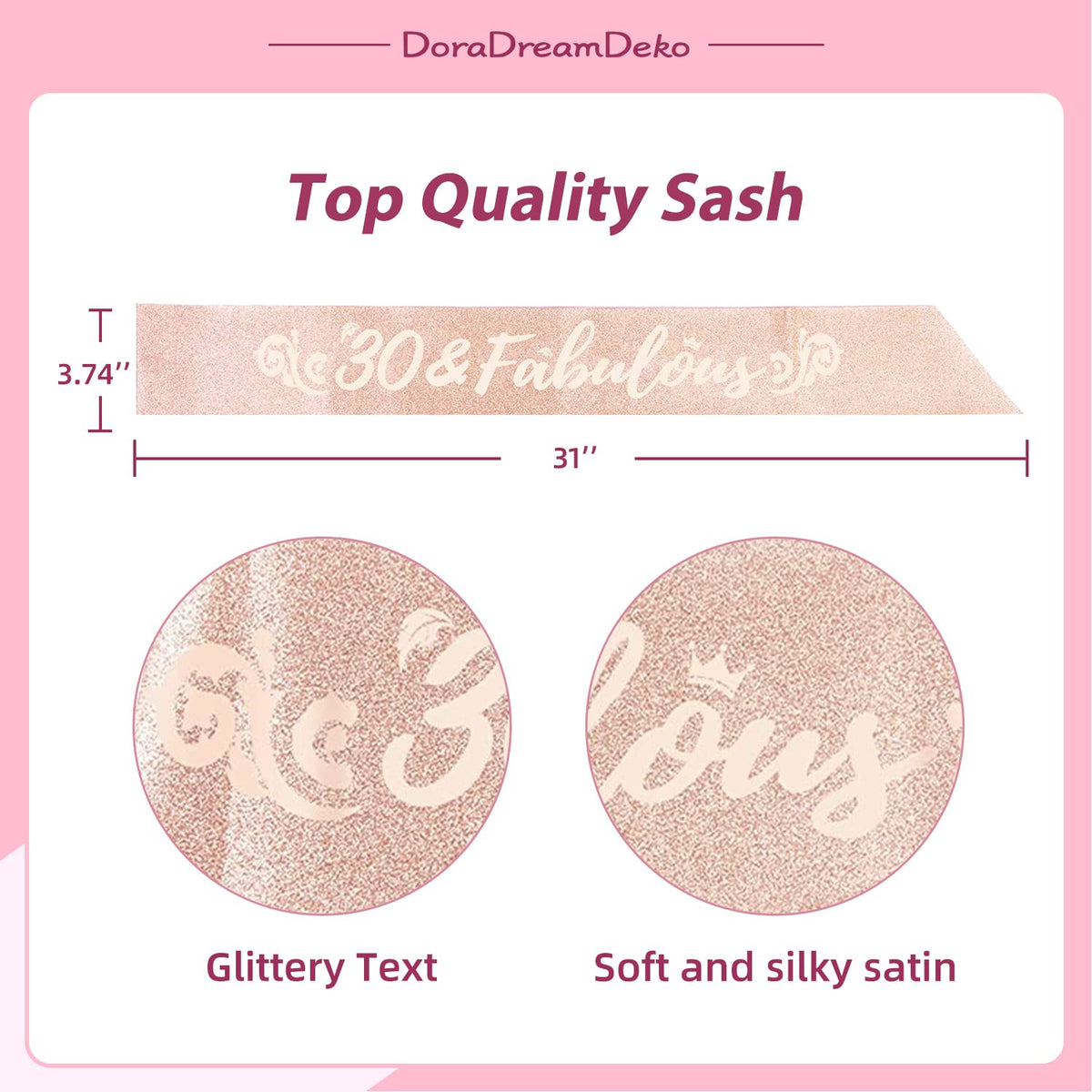 - Q: What is included in the DORADREAMDEKO 30th Birthday Sash and Tiara set? A: The set includes a fabulous glitter sash that reads '30 & Fabulous' and a premium metal tiara adorned with pink rhinestones.