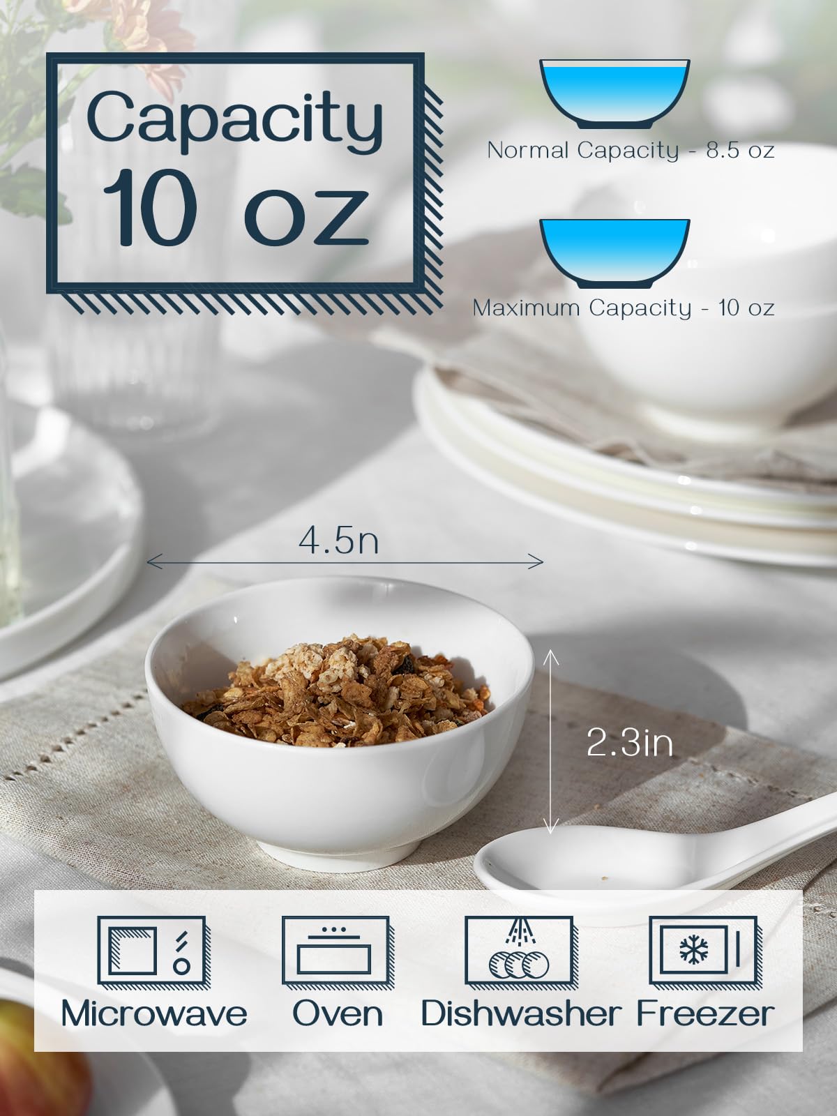 Dowan 10 Oz Small Dessert Bowls - 4.5'' Ceramic Cereal Bowls Set Of 8 - Porcelain White Bowls For Side Dishes, Rice, Ice Cream,