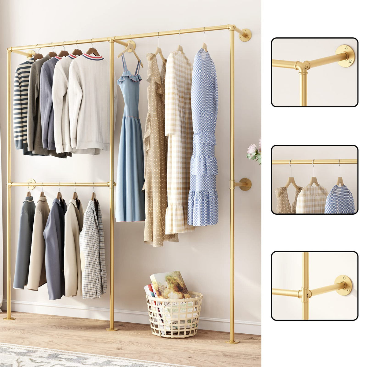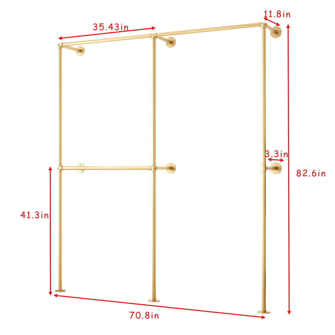 Dr.Iron Industrial Pipe Gold Clothing Racks With Double Bar, Industrial Pipe Clothes Racks Wall Mounted, Heavy Duty Gold Closet
