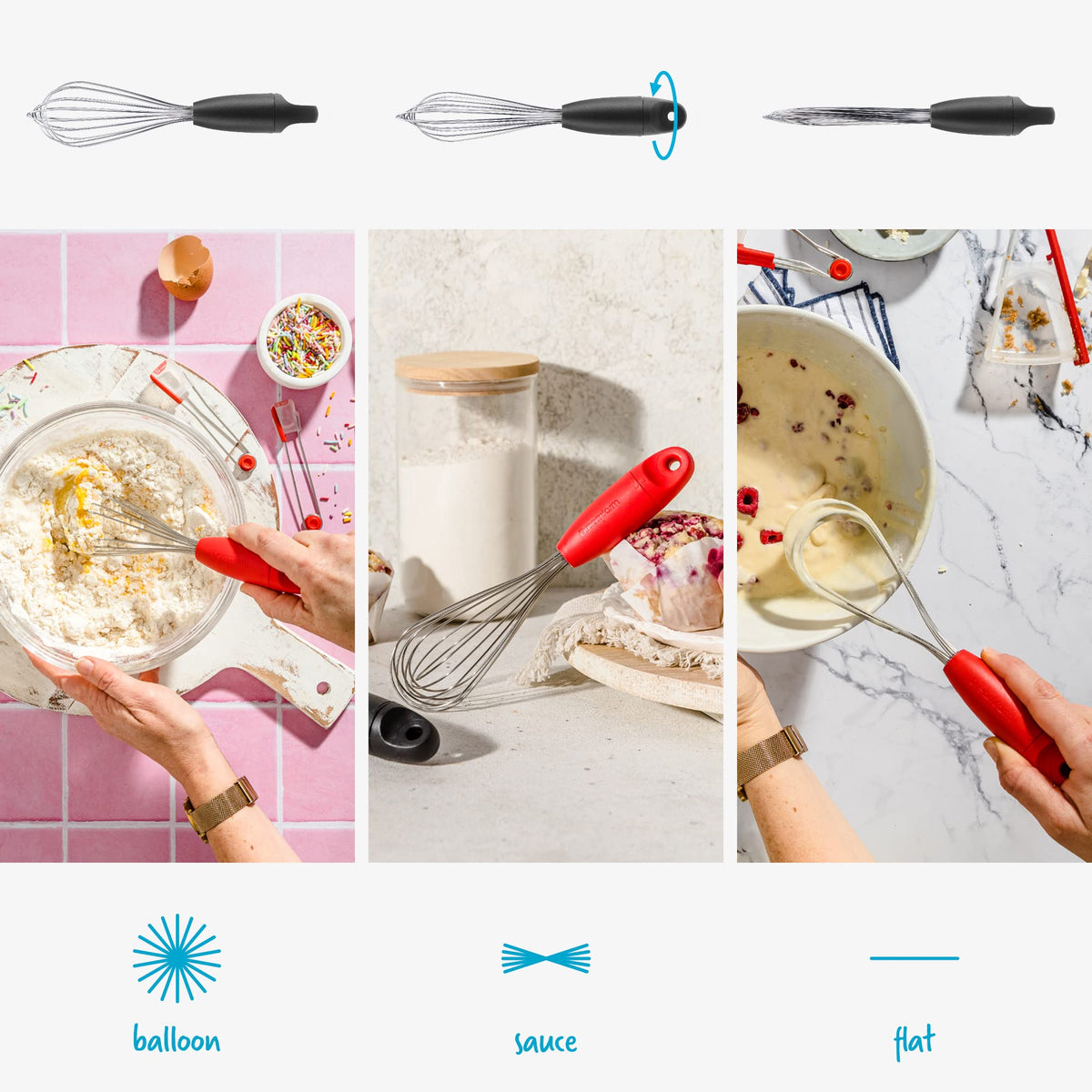 Dreamfarm Mini Flisk | 3 in 1 Stainless Steel Whisk with Ergonomic Handle | Balloon Whisk Sauce Whisk and Flat Whisk Combined Into One | Space Saving Whisk for Baking Cooking | Black Mini