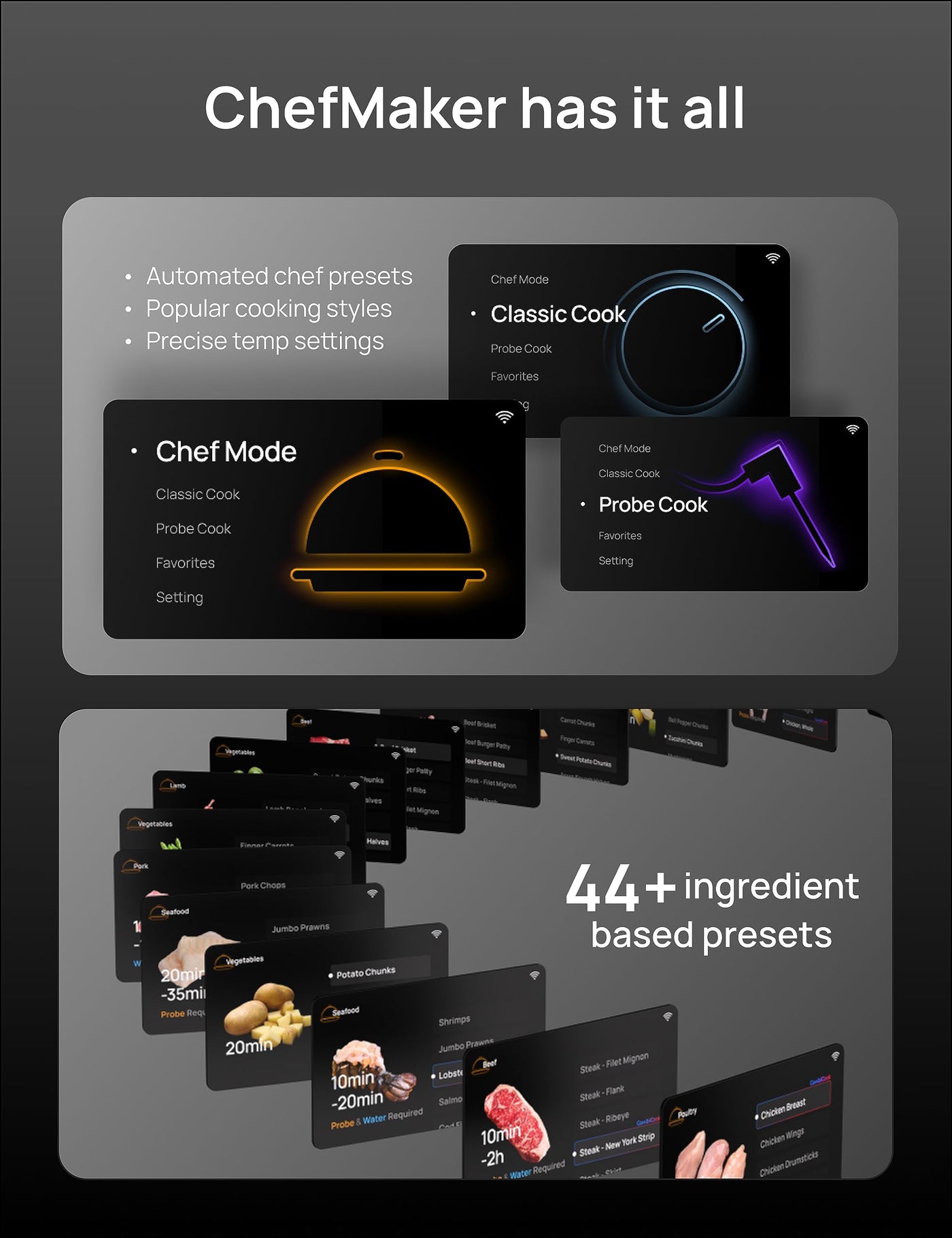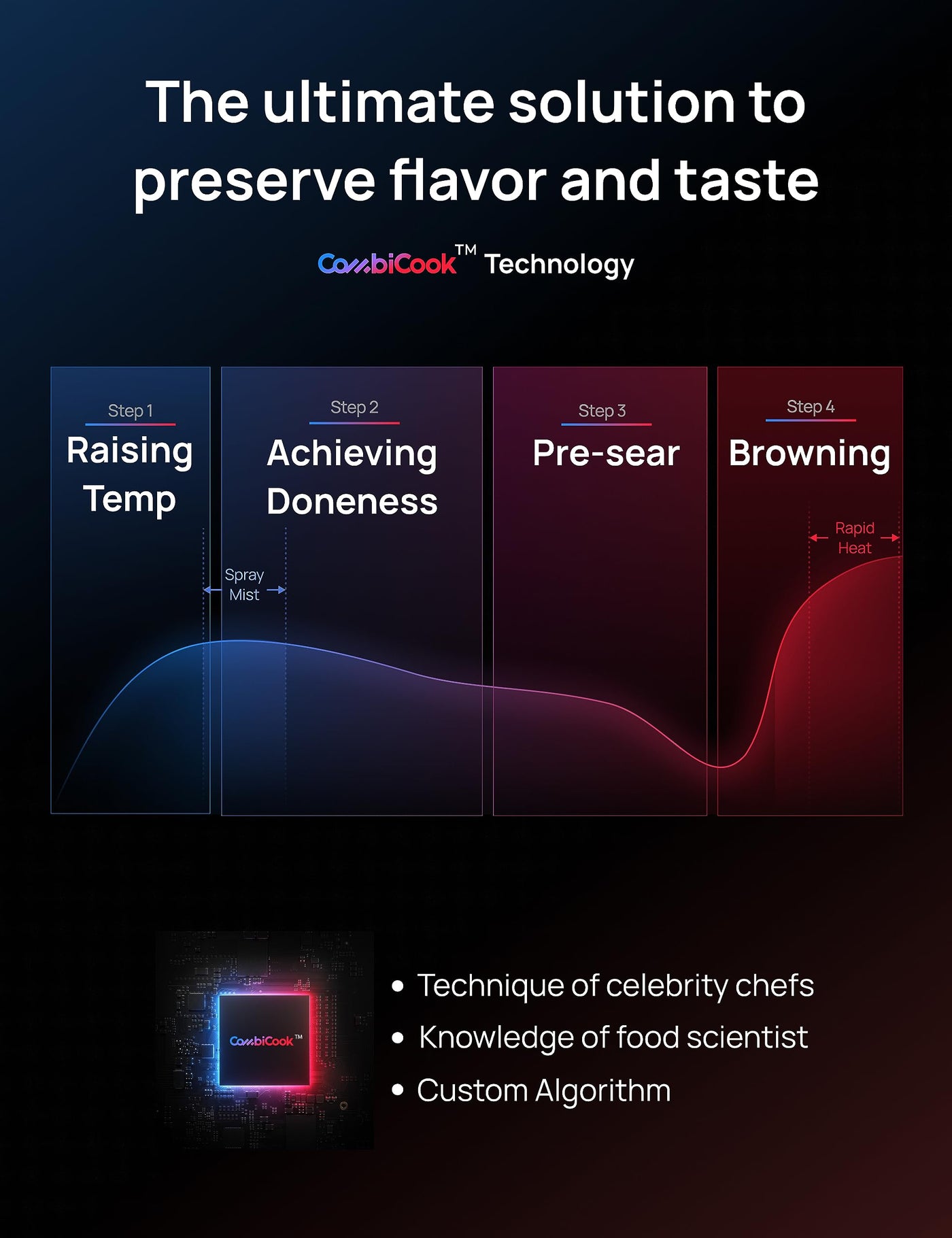 - Q: How does the Dreo ChefMaker ensure perfectly cooked meals? A: The ChefMaker uses a precise cook probe, water atomization, and super convection heating systems to automatically divide the cooking process into steps, achieving a balance of doneness, browning, juiciness, and aroma.