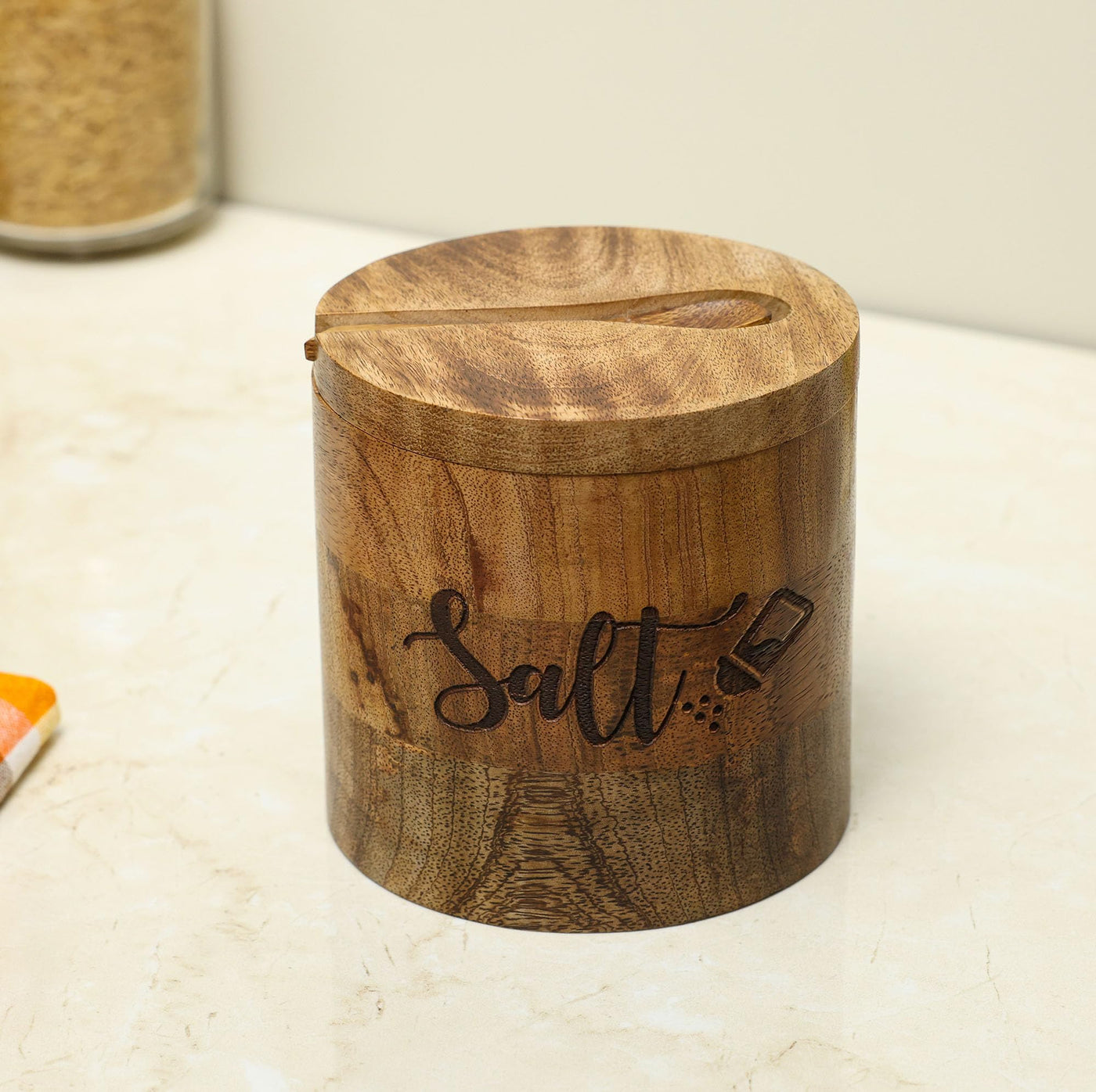 Dudki Wooden Salt Box With Magnetic Lid With Attached Spoon On Top| Round Salt Container| Bowl Pot Jar Salt Box | Mango Wood For